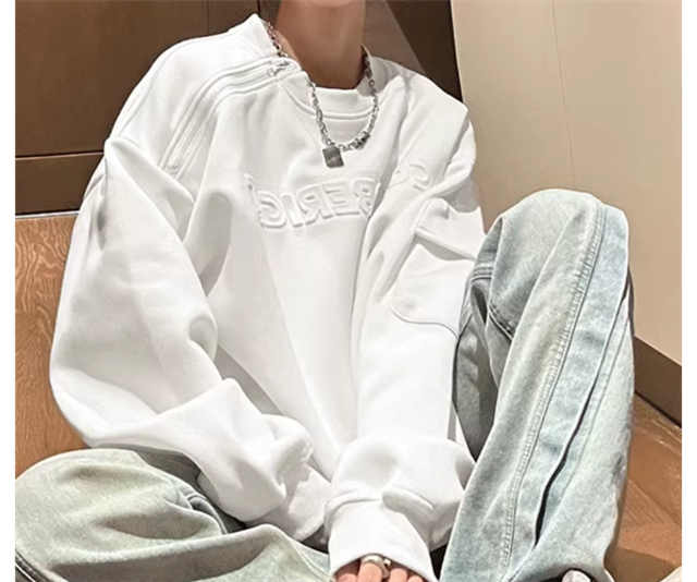 メンズ トップス プルオーバー スウェット ミドル丈 長袖 ドロップショルダー ラウンドネック ストリート ファスナー 異国風 アメカジ カジュアル おしゃれ かっこいい レトロ ラフ スポーティー ルーズ クール 文字 テキスト 英語 春 秋 10代 20代 学生 体型カバー 普段使い 着回し トレンド 流行 S M L XL 大きいサイズ ゆったり ゆる 大きめ オーバーサイズ ホワイト ブラック