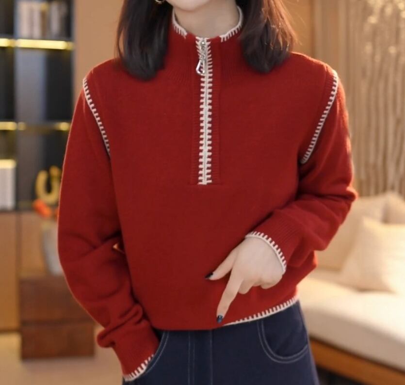 レディースニット ハーフジップトップス 長袖トップス 配色ニット 春服 秋服 きれいめコーデ 着痩せトップス 体型カバー ゆったりニット 大人カジュアル 上品コーデ 通勤コーデ デート服 シンプルおしゃれ 韓国風ファッション 高見えトップス フェミニンコーデ 人気ニット トレンドトップス