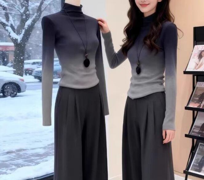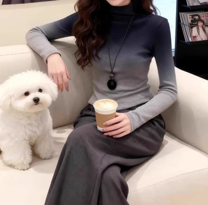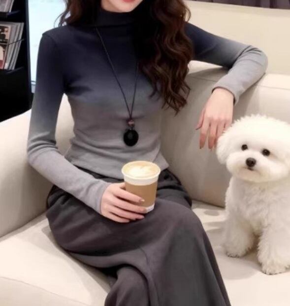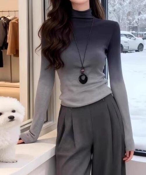 グラデーショントップス、大きいサイズTシャツ、長袖カットソー、春トップスレディース、スリム見えトップス、ハイネックTシャツ、体型カバー服、着痩せトップス、オフィスカジュアル、大人フェミニンコーデ