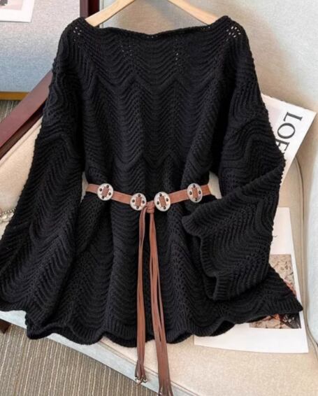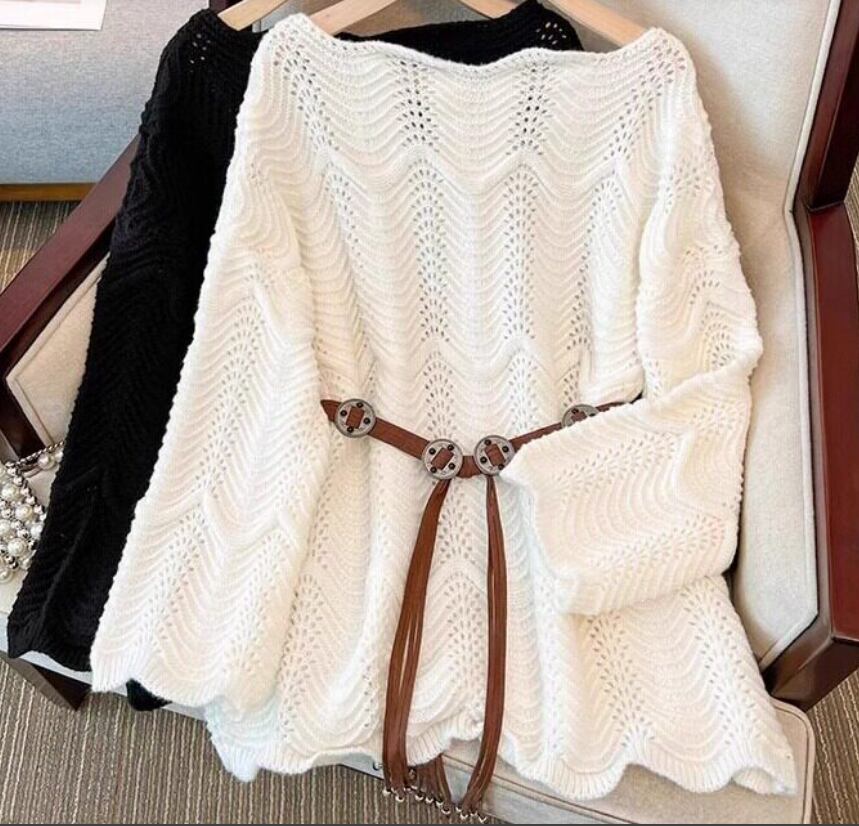 ウエストマークニット、ベルト付きトップス、春ニットレディース、体型カバートップス、ゆったりシルエット、ぽっちゃりコーデ、ミルキーニット、長袖セーター、韓国風ゆるかわ、大人フェミニン