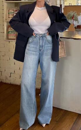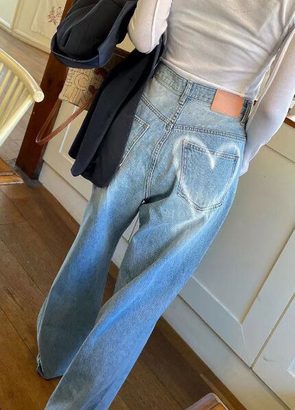 ヴィンテージデニム、ハイウエストパンツ、美脚ジーンズ、ワイドストレートデニム、レトロジーンズ、春ジーンズレディース、体型カバーボトムス、韓国ファッション、脚長パンツ、大人カジュアルコーデ