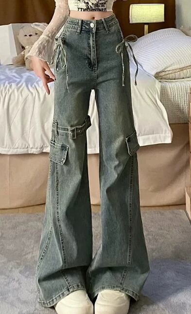 Y2Kジーンズ フレアデニムパンツ 美脚ワイドパンツ 蝶結びデザインデニム ベルト付きデニム 脚長パンツ 韓国ストリート ヴィンテージ風ジーンズ 体型カバーズボン ハイウエストジーンズ