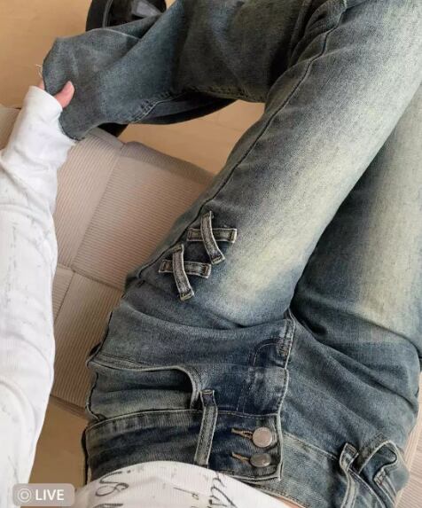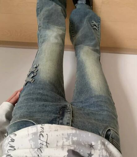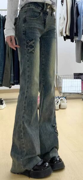 クロス刺繍デニム フレアジーンズ ハイウエストパンツ 美脚デニム 韓国風カジュアル 体型カバーズボン Y2Kジーンズ レディース脚長パンツ ヴィンテージブルーデニム 秋冬映えパンツ