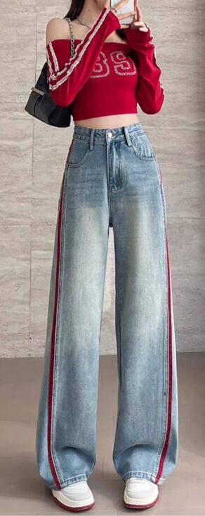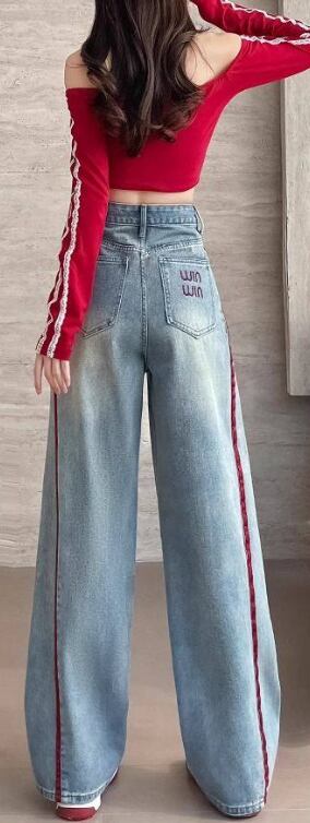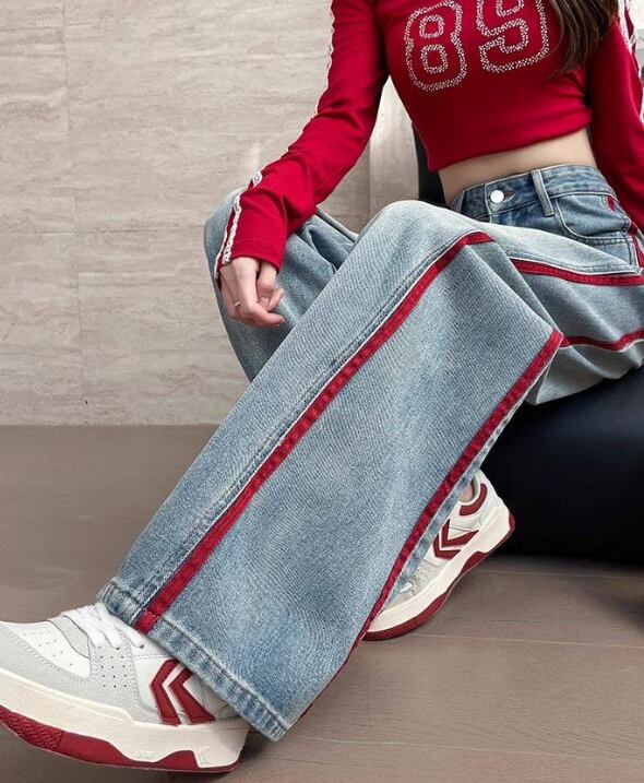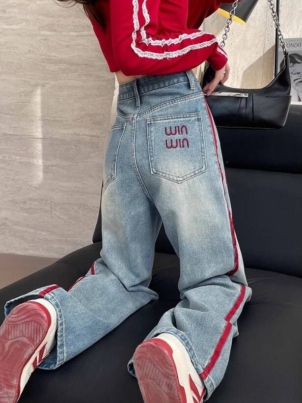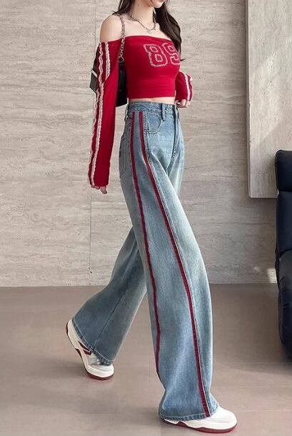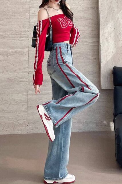 デニム レディース ワイドパンツ 春 秋 配色デニム ラインパンツ ストリート系 ハイウエスト 美脚見え 体型カバー カジュアルパンツ トレンドデニム 大きいサイズ ゆったりパンツ 脚長効果 人気アイテム
