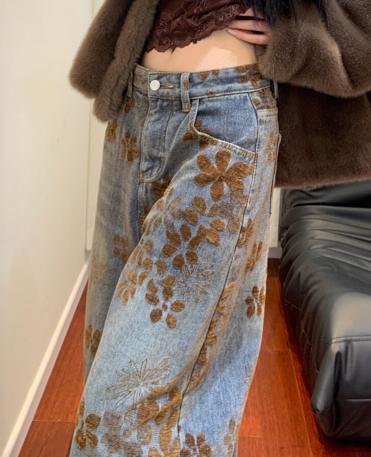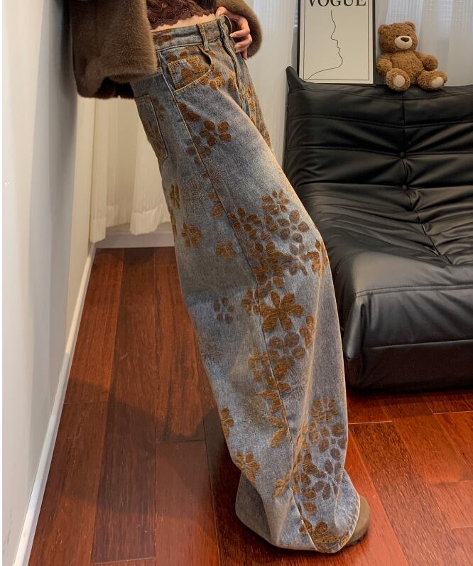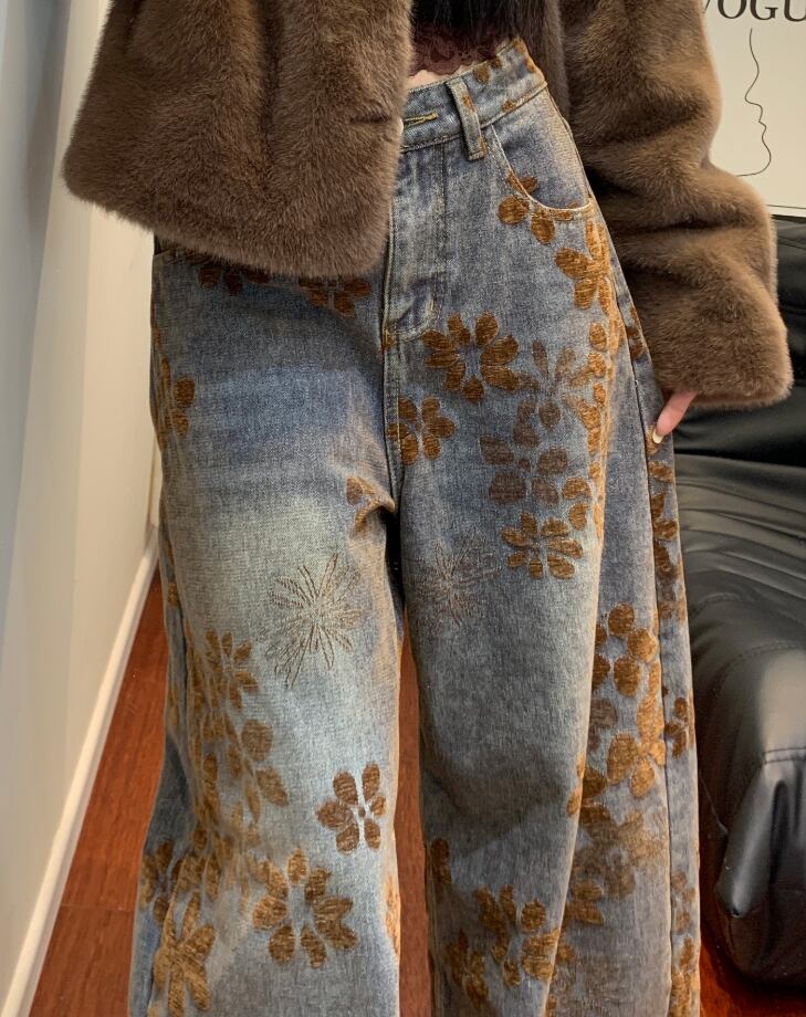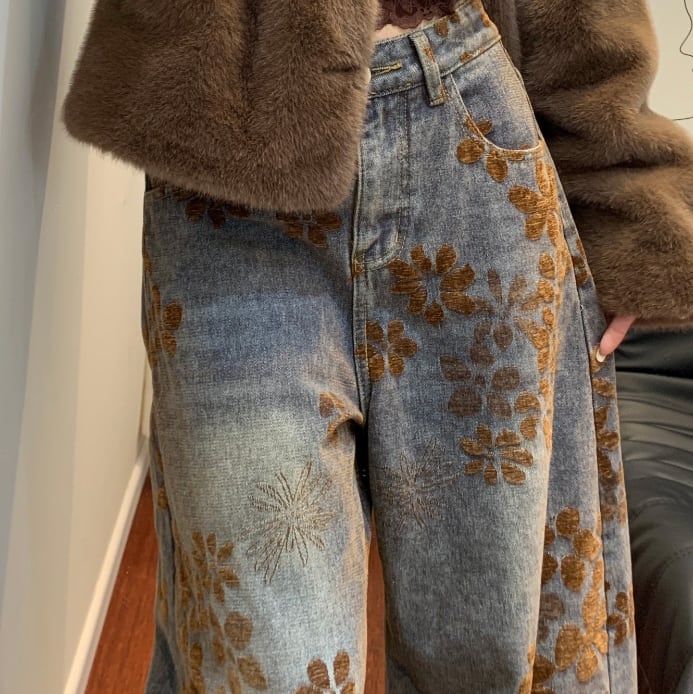 花柄デニム レディース 秋冬 ワイドパンツ ゆったりデニム ストレートパンツ 大きいサイズ 美脚パンツ 体型カバーパンツ ヴィンテージ風デニム おしゃれジーンズ 楽ちんパンツ トレンドボトムス 冬コーデ 大人カジュアル ナチュラルスタイル デニムワイドパンツ 総柄パンツ 柄入りデニム リラックスパンツ