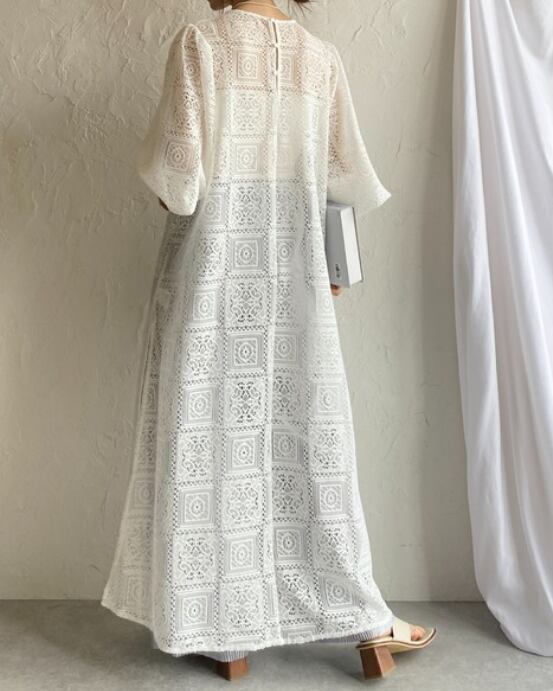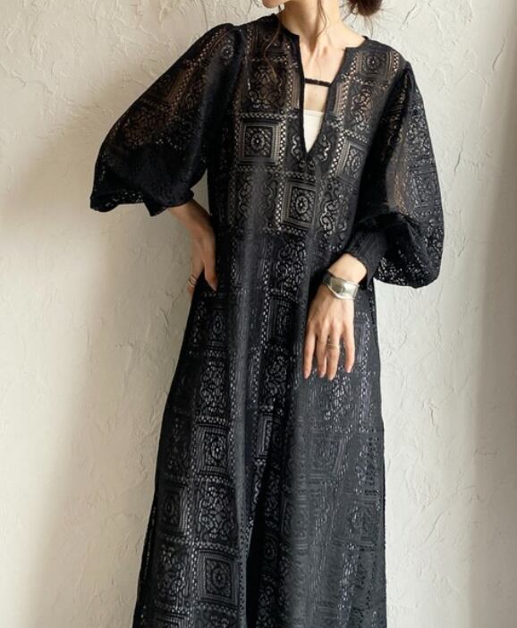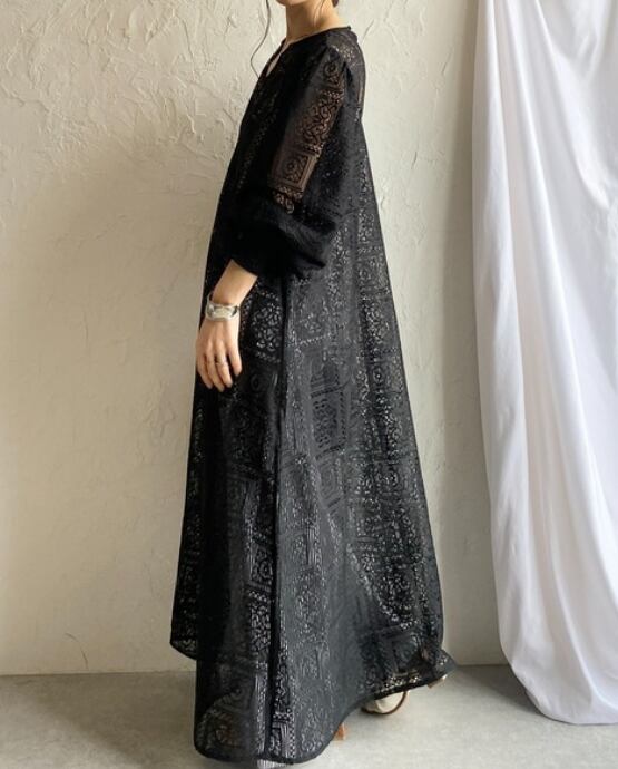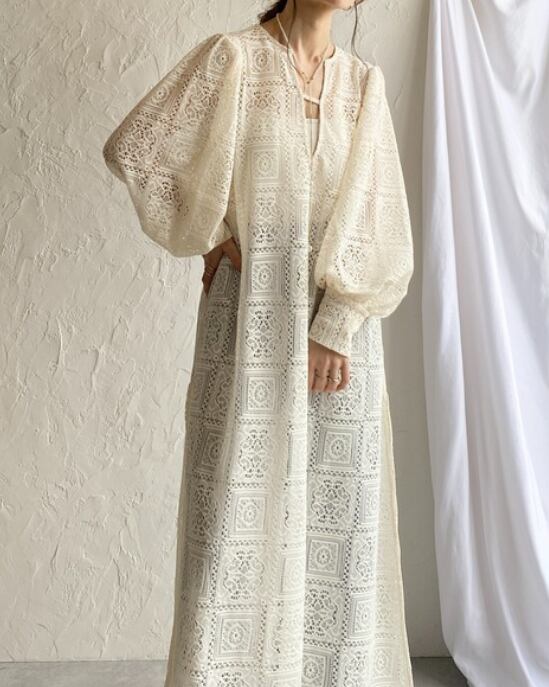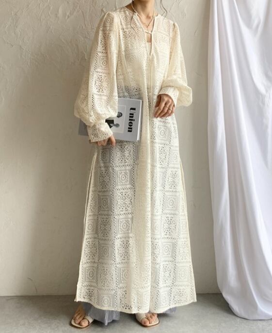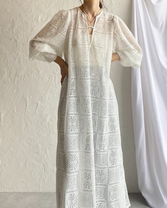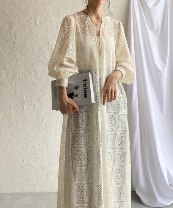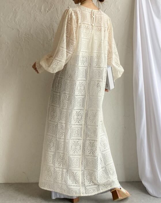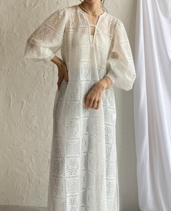 繊細な総レースが目を惹く、存在感たっぷりのロングワンピース。