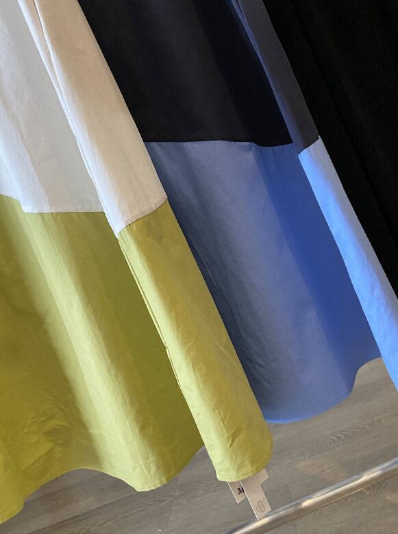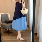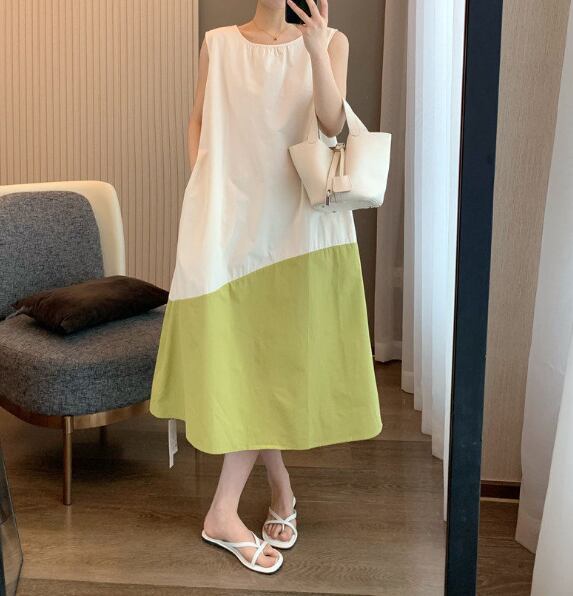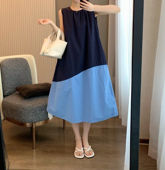 ロングワンピース レディース 配色ワンピース バイカラーワンピース ノースリーブワンピース 春ワンピース 夏ワンピース ゆったりワンピース 体型カバーワンピース フレアワンピース 大人ワンピース きれいめワンピース 上品ワンピース カジュアルワンピース ミモレ丈ワンピース 春夏コーデ レディースファッション マスタードワンピース ブルーワンピース デザインワンピース デイリーワンピース