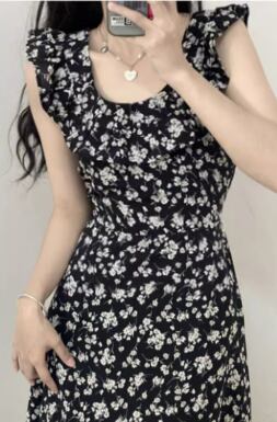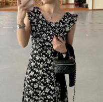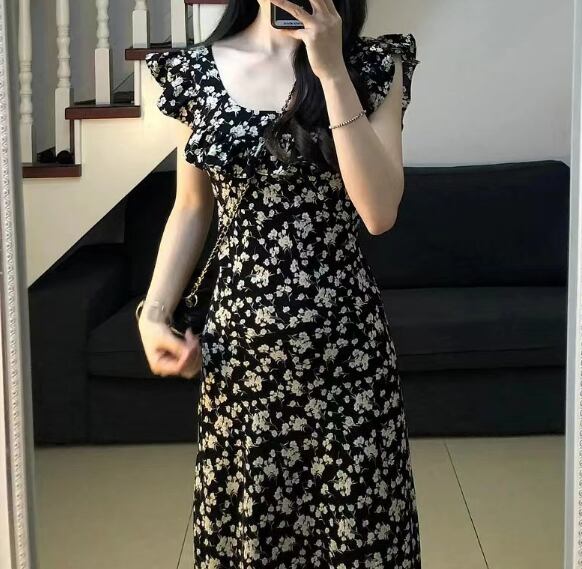花柄ワンピース レディース ロングワンピース 夏ワンピース フレアワンピース フリル袖ワンピース 黒ワンピース 大きいサイズ レディースファッション きれいめワンピース フェミニンワンピース デートワンピース お出かけコーデ 着痩せワンピース 韓国風ファッション 春夏ワンピース 上品ワンピース 大人かわいい ハイウエストワンピース 半袖ワンピース Aラインワンピース