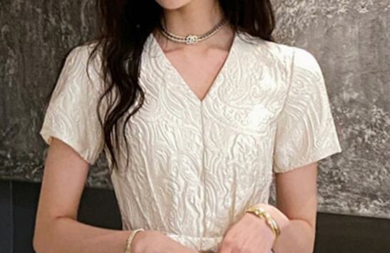 Vネックデザインで顔まわりをすっきり見せ大人の印象に。
