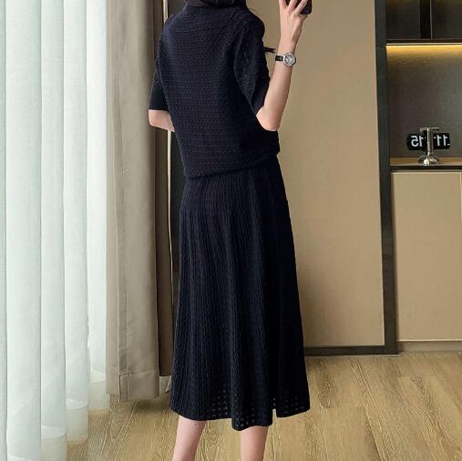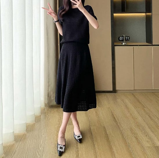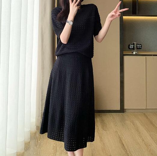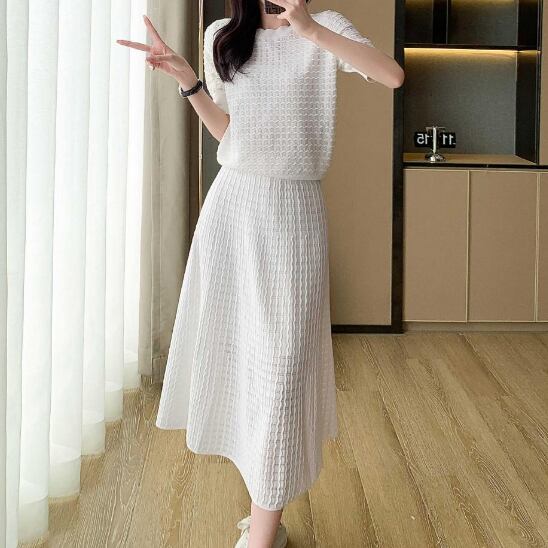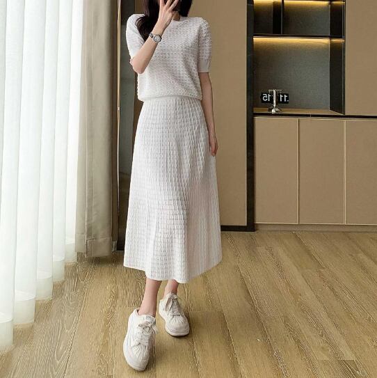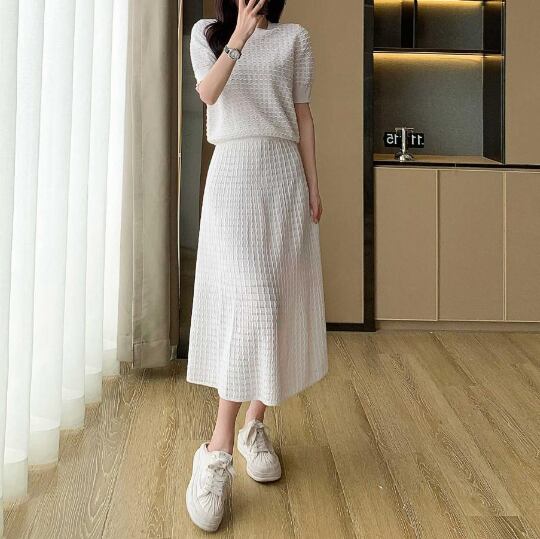 ニットセットアップ レディースセットアップ 2点セットコーデ 半袖ニット フレアスカート ロングスカート 上品コーデ きれいめファッション 通勤コーデ 春コーデ 夏コーデ 大人フェミニン オフィスカジュアル デート服 高見えコーデ モノトーンコーデ 着回しアイテム 体型カバー 細見え効果 SサイズMサイズLサイズXLサイズ