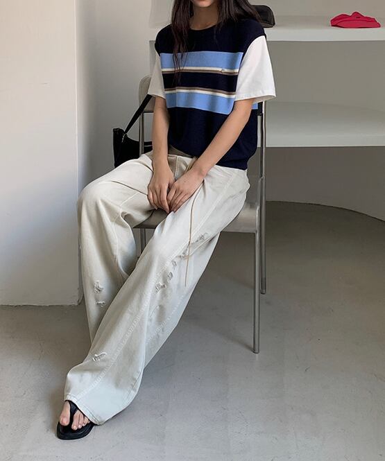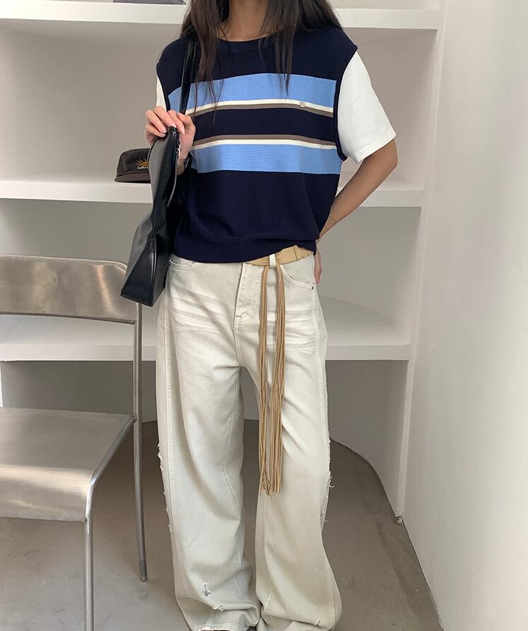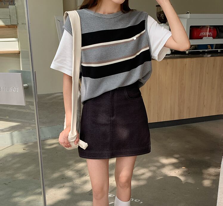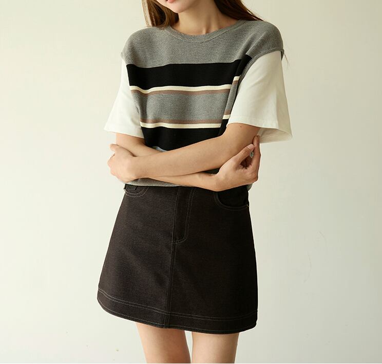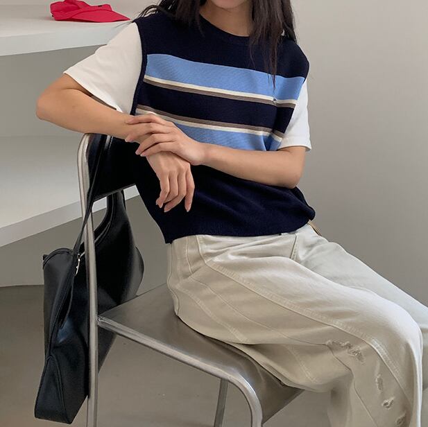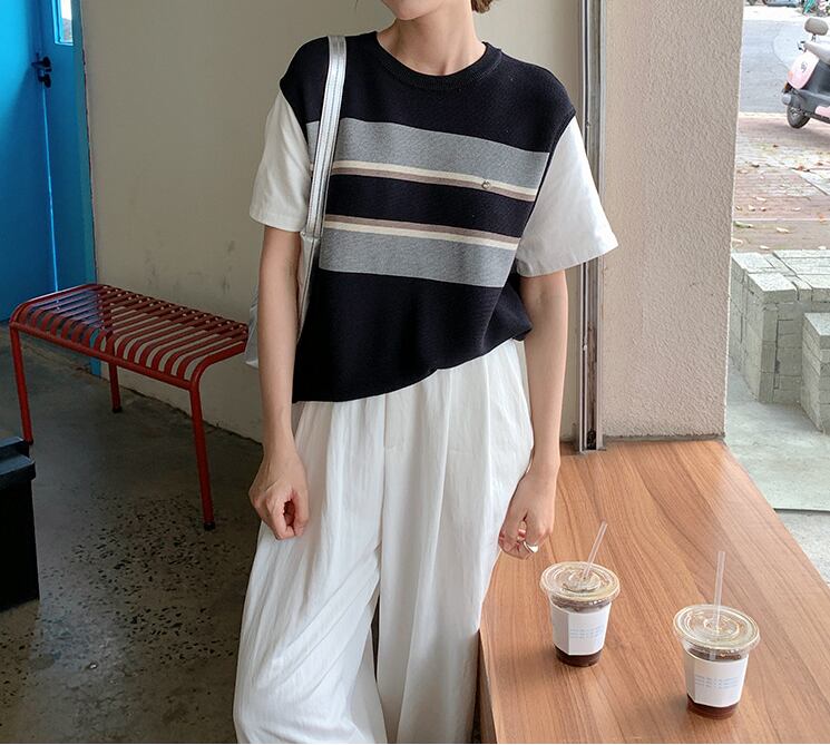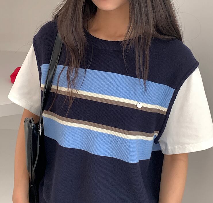 半袖ニットトップス ベスト風 レディース 新作 ボーダー 重ね着風 配色デザイン ゆったり 体型カバー ワンサイズ カジュアル 通勤 デート
