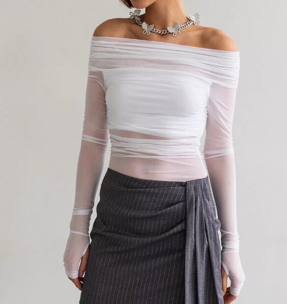 オフショルダー トップス レディース シアートップス 長袖カットソー 透け感トップス セクシートップス タイトトップス 春夏ファッション 韓国風コーデ 大人きれいめ デートコーデ モード系ファッション フェミニンスタイル 細見えトップス インナートップス レイヤードコーデ ナイトアウトコーデ クラブファッション トレンドトップス ブラックトップス ホワイトトップス