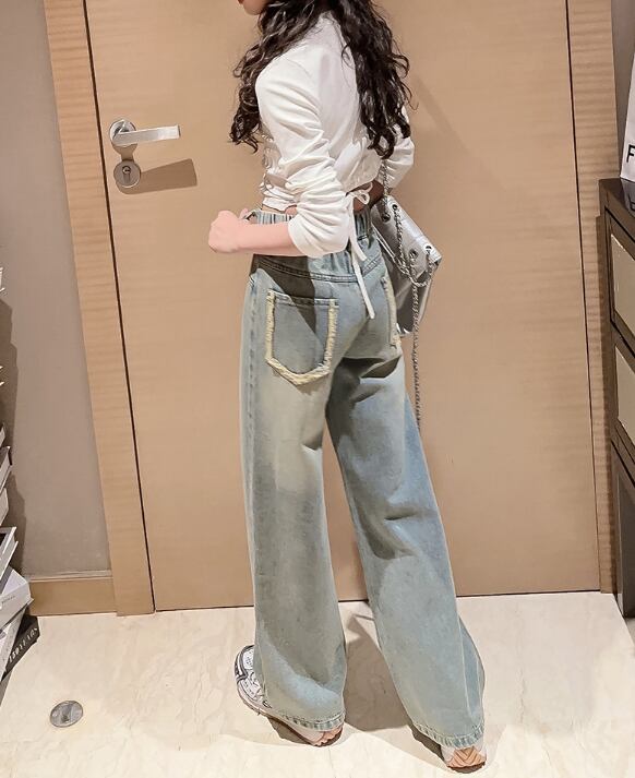 デニム ワイドパンツ ゆったりストレート ロング丈 韓国風 カジュアル 通学 おしゃれ 女の子 トレンド ボトムス