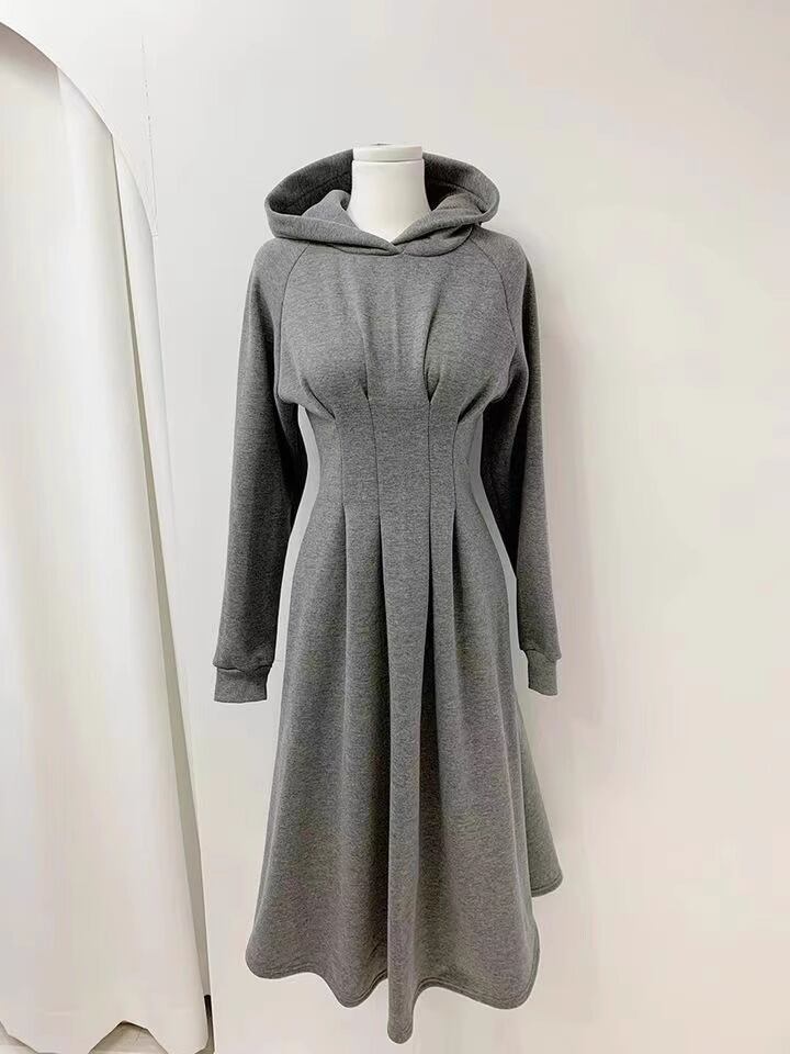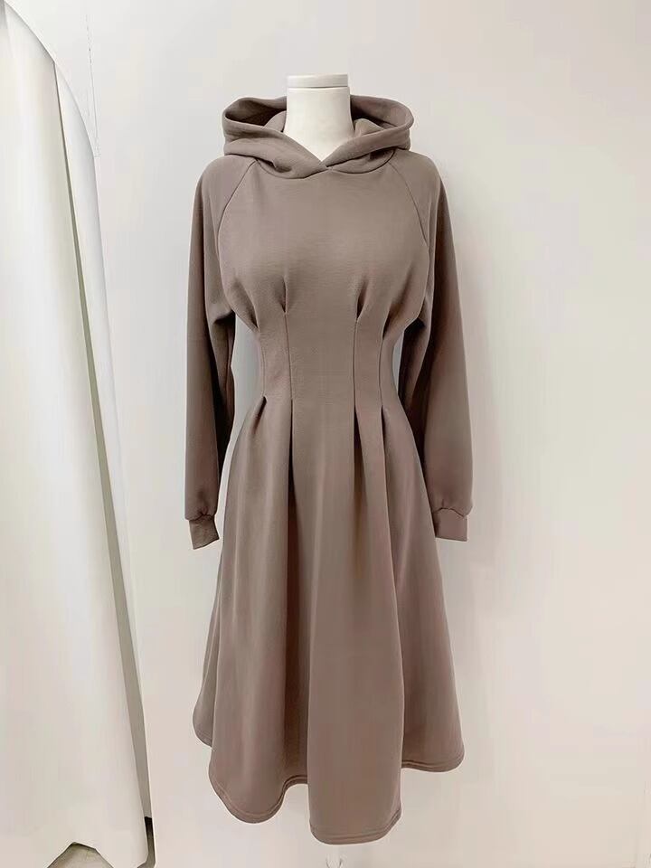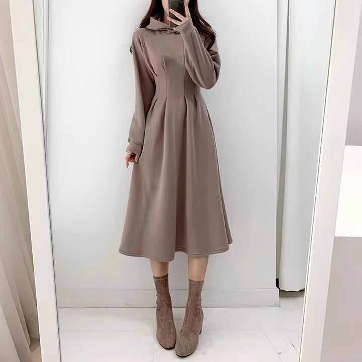 ワンピース フレアワンピース 膝下 長袖 フード付き かわいい シンプル カジュアル おしゃれ スポーティー ラブリー キュート 無地 春 秋 冬 10代 20代 30代 通学 デート お出かけ 女子会 お泊まり 休日 アウトドア 旅行 ガーデン 黒 ブラック ブラウン 灰色 グレー