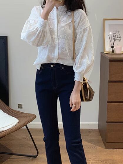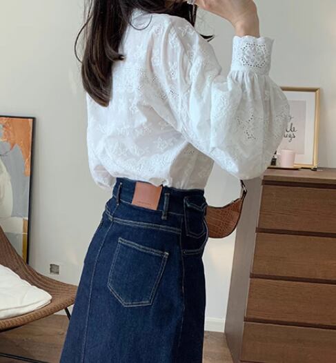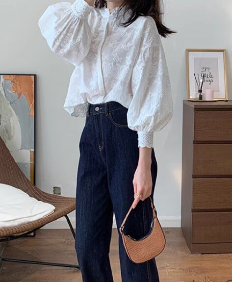 トップス 長袖 スタンドカラー 刺繍 きれいめ 上品 おしゃれ 無地 春 夏 秋 OL デート お出かけ S M L ホワイト