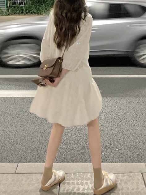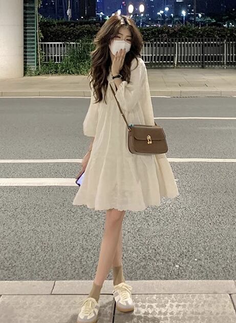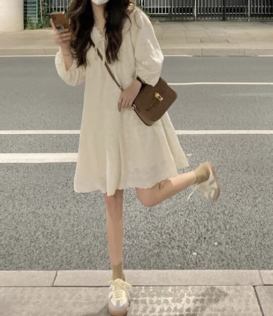 レディース スカート トップス ワンピース ミニ 長袖 パフスリーブ Vネック Aライン かわいい カジュアル おしゃれ 韓国 S M L ベージュ