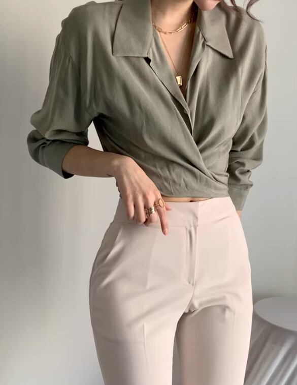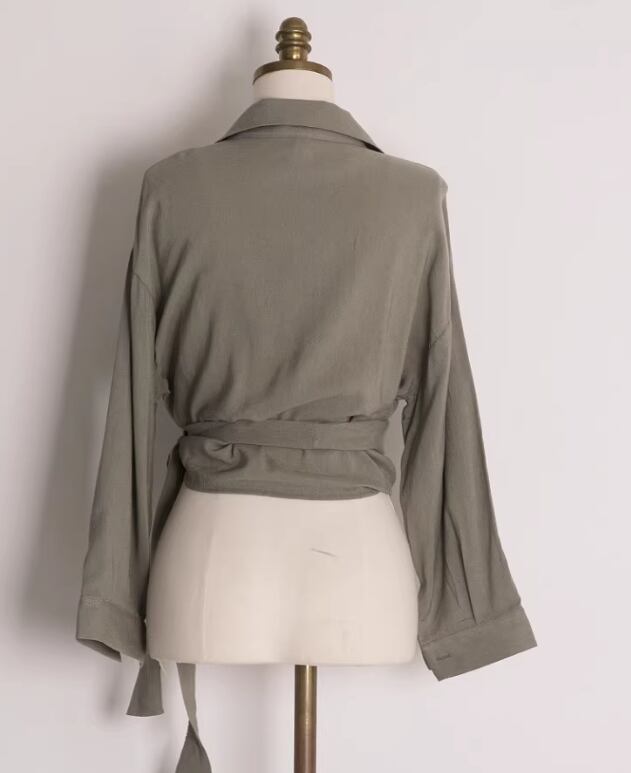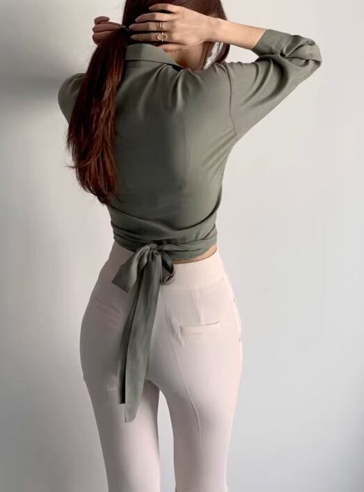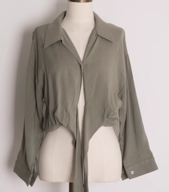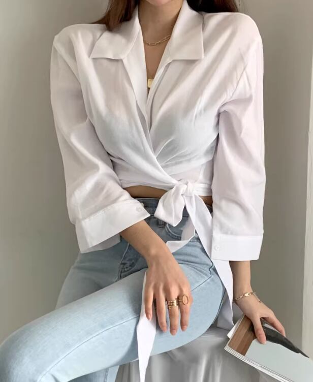 レディース トップス シャツ ブラウス カットソー 7分袖 長袖 襟付き ウエストリボン きれいめ 上品 レトロ ガーリー キュート 無地 韓国 フリーサイズ ホワイト モスグリーン
