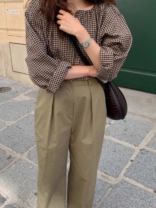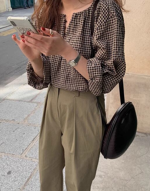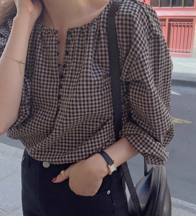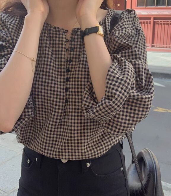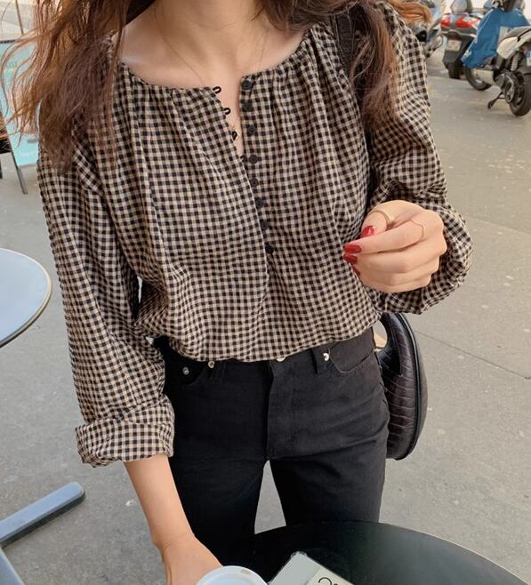 レディース トップス シャツ ブラウス カットソー 長袖 ラウンドネック かわいい 大人可愛い きれいめ 上品 おしゃれ レトロ チェック 韓国 S M L XL ブラウン