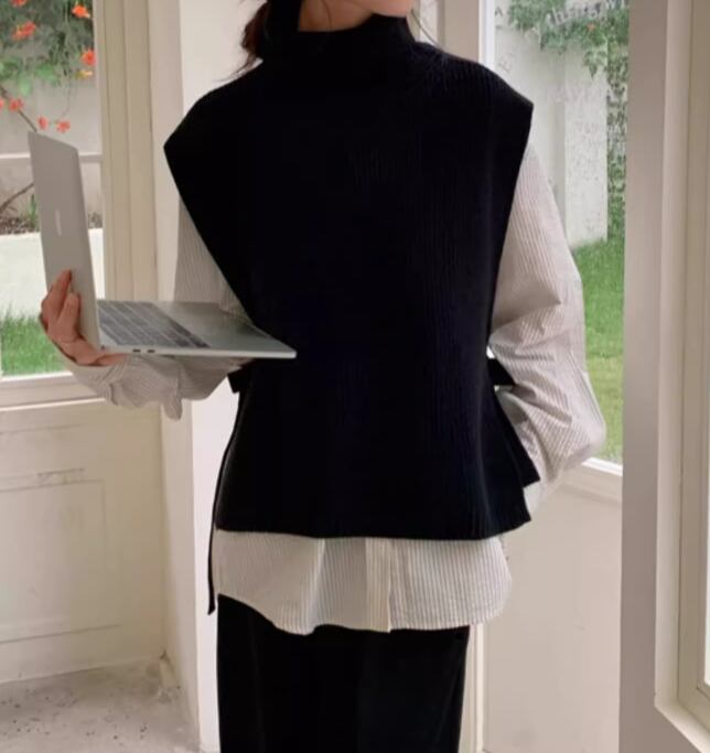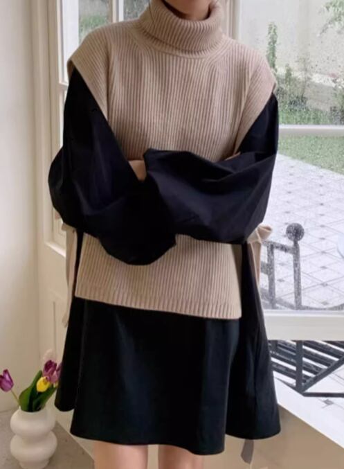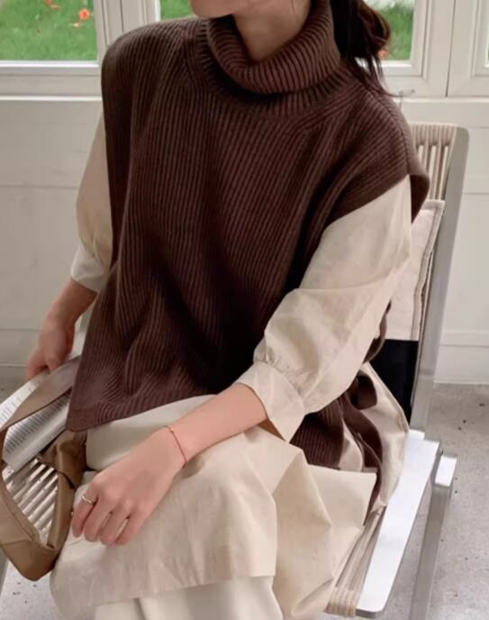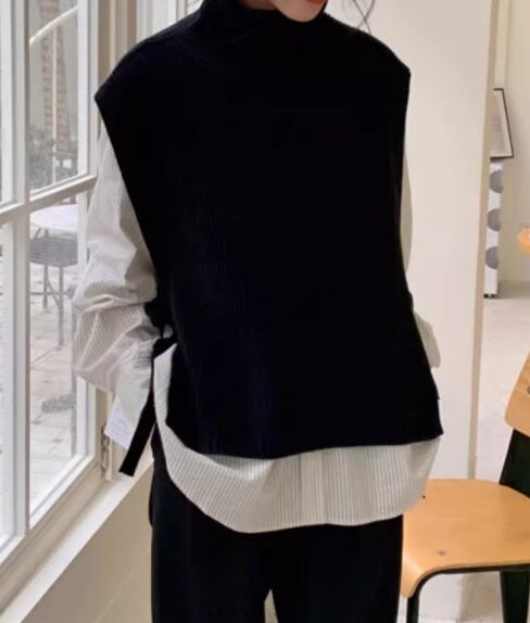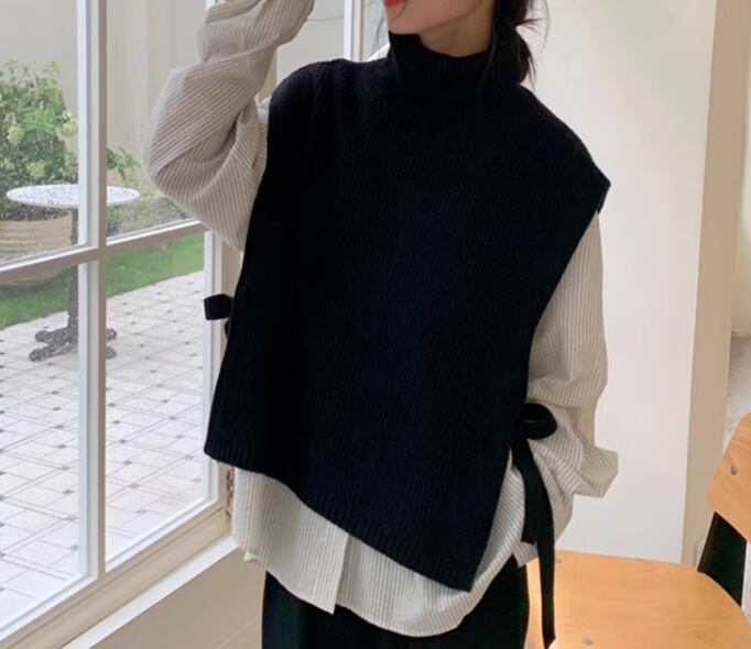 レディース トップス カットソー ニット ベスト 袖なし ラウンドネック リボン 大人可愛い きれいめ 上品 おしゃれ 韓国 フリーサイズ ブラック ブラウン
