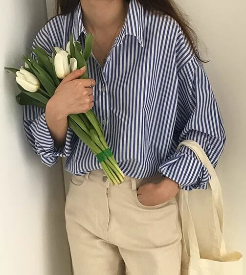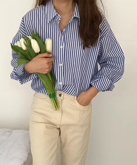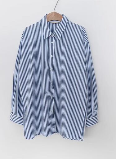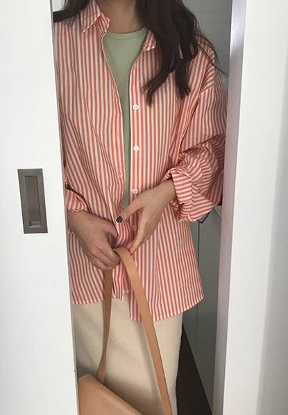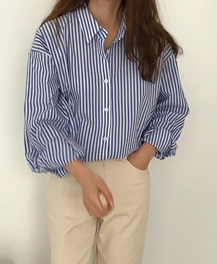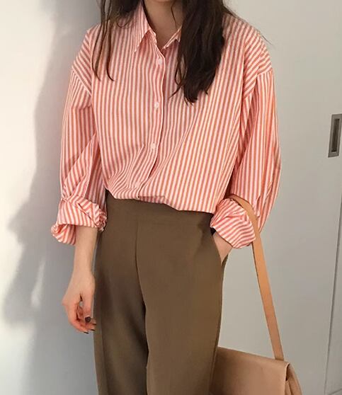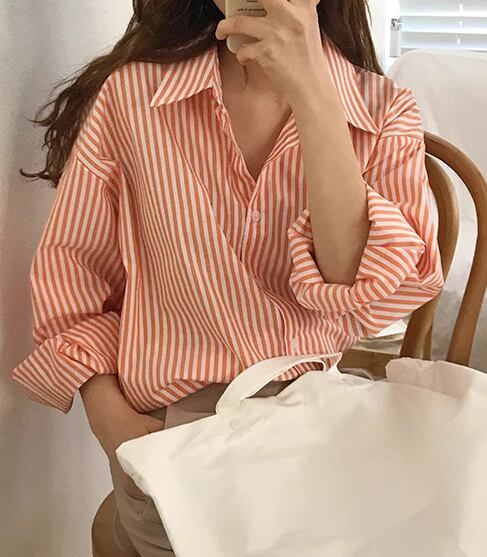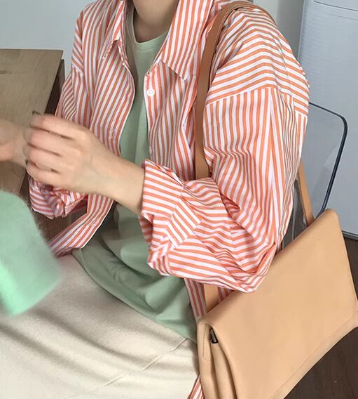 レディース トップス シャツ ブラウス 長袖 ドロップショルダー 襟付き 大人可愛い きれいめ かっこいい ストライプ フリーサイズ オレンジ ブルー