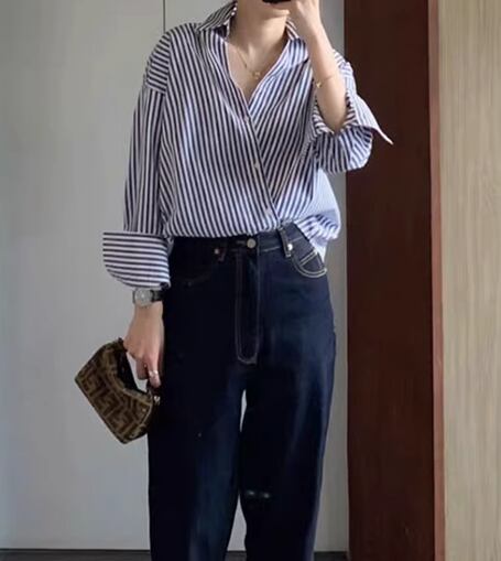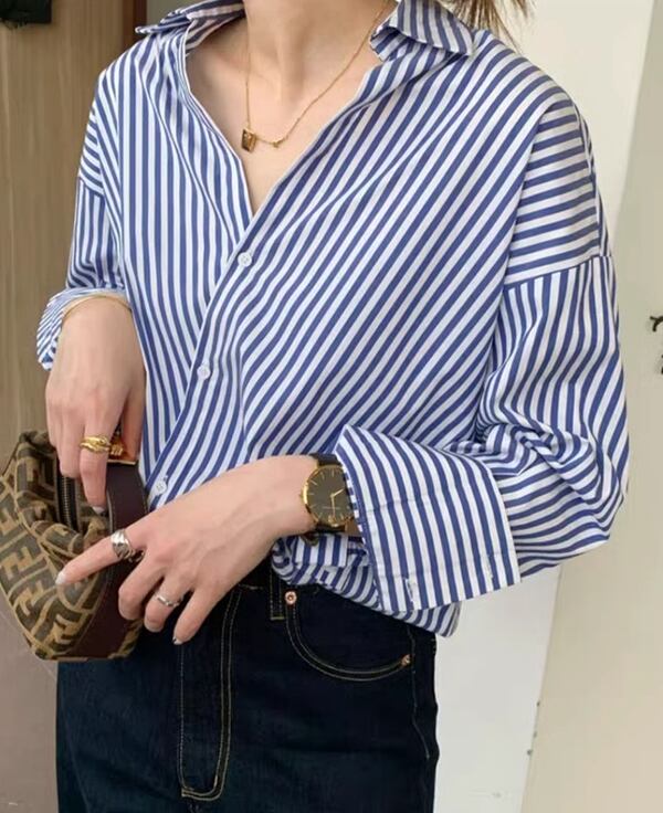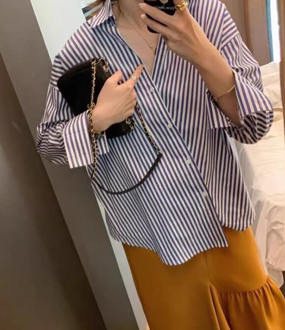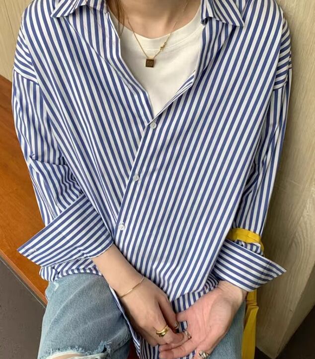 レディース トップス シャツ ブラウス 長袖 Vネック 襟付き オーバーサイズ 大人可愛い きれいめ 上品 おしゃれ ストライプ フリーサイズ ブルー