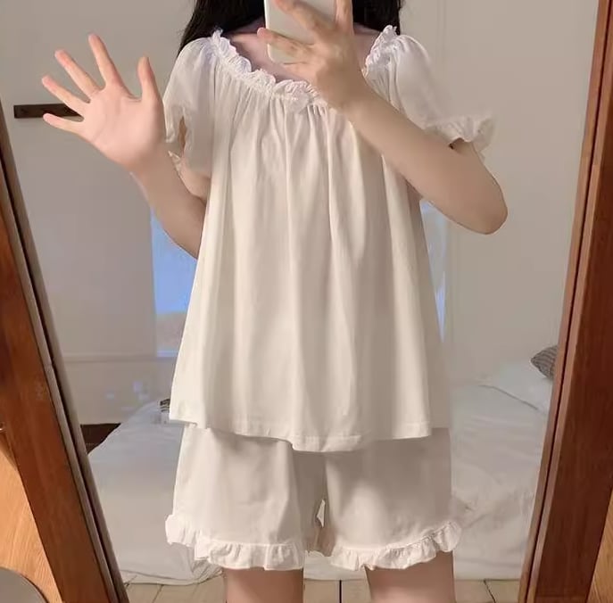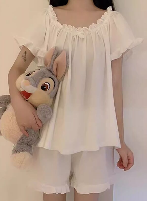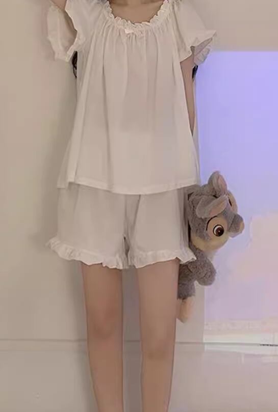 レディース 部屋着 ショート 半袖 フリル袖 ラウンドネック 襟なし レース ふわふわ かわいい M L XL ホワイト