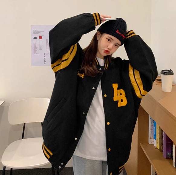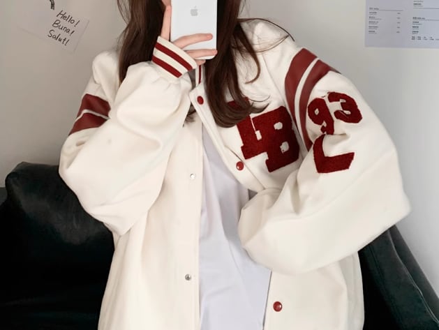 野球のユニフォーム風のデザインがおしゃれな長袖のミドル丈ジャケット。