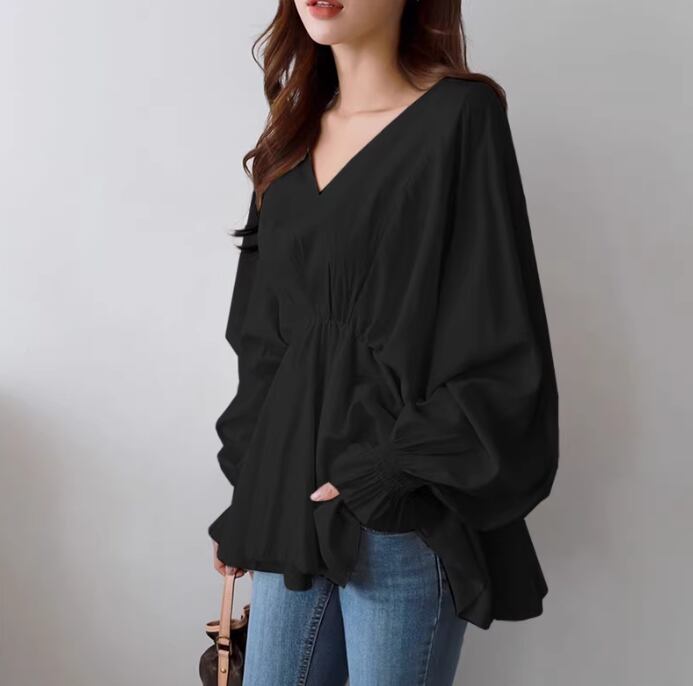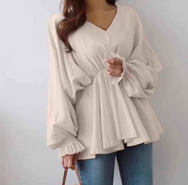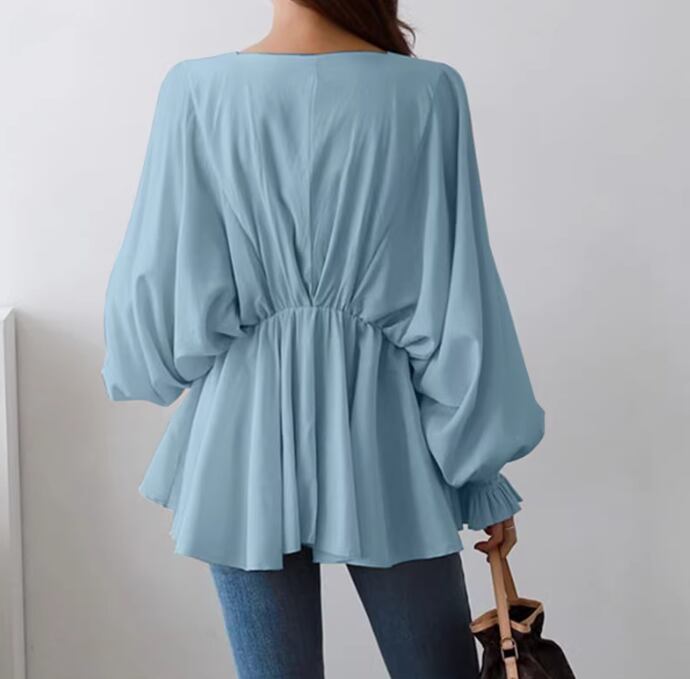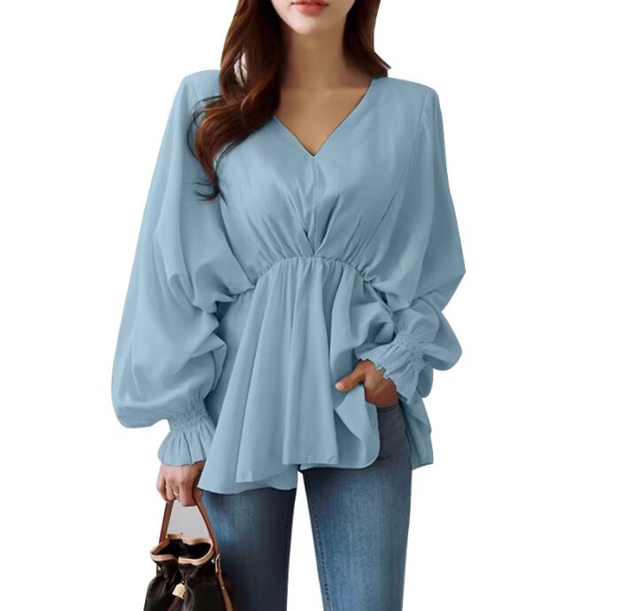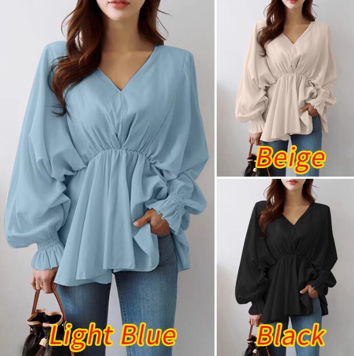 レディース トップス シャツ ブラウス フレア 丈長 長袖 ボリューム袖 フリル袖 Vネック フレア スリム フェミニン タック タックプリーツ シフォン ウエストマーク 薄手 きれいめ カジュアル 上品 おしゃれ ルーズ エレガント 主役級 存在感 クラシカル ロマンティック 無地 秋 母の日 クリスマス バレンタイン ママ オフィス OL デート お出かけ 女子会 ホテル ショッピング 合コン コンパ カフェ 体型カバー インスタ映え S M L XL 2XL 3XL ブラック ブルー アプリコット