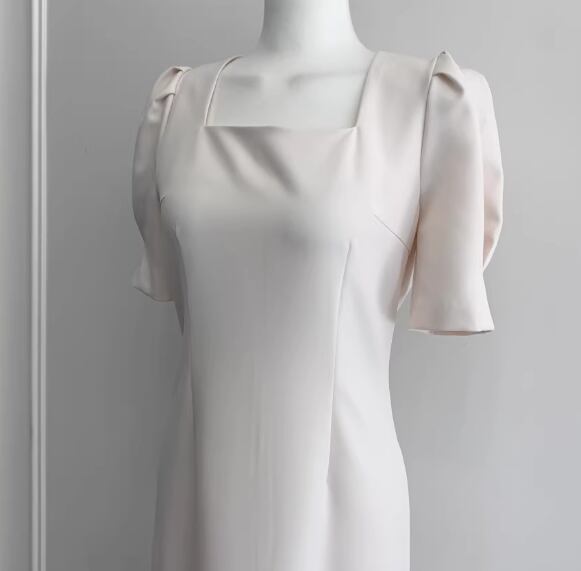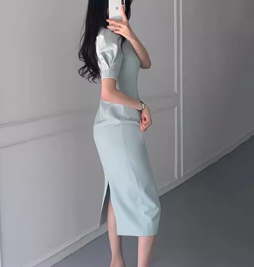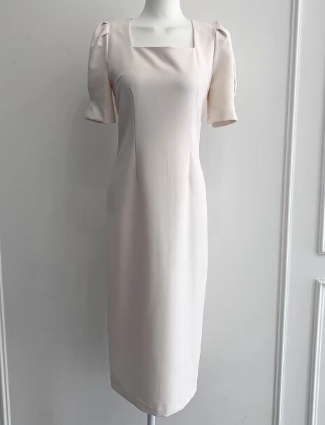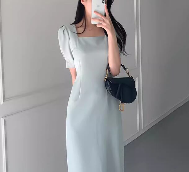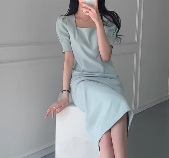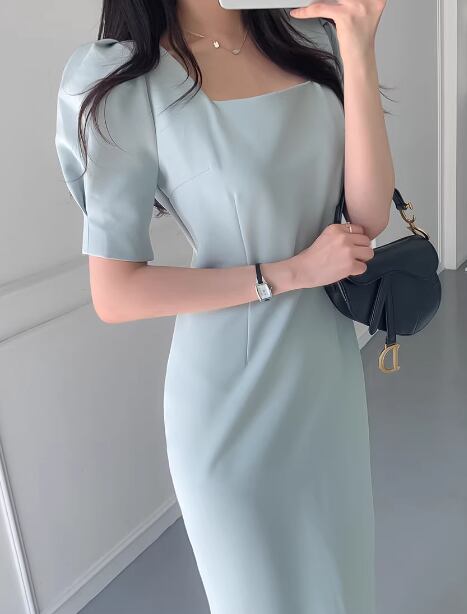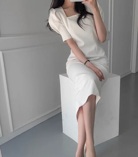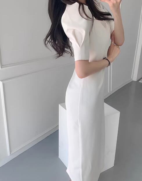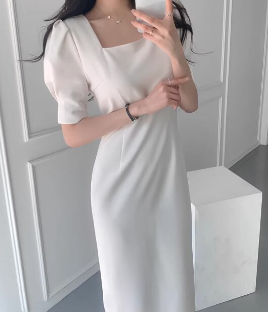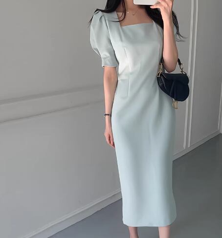 レディース ワンピース プルオーバー ドレス ミモレ 半袖 ボリューム袖 パフスリーブ ラウンドネック スクエアネック スリム 細身 プリーツ スリット ハイウエスト 大人可愛い きれいめ シンプル 上品 おしゃれ エレガント 知的 清潔感 爽やか シック 高級感 無地 夏 デート お出かけ パーティー イベント レストラン 休日 ホテル ショッピング 韓国 普段使い 清楚 S M L 小さめ ホワイト ブルー 大人カラー 大人デザイン