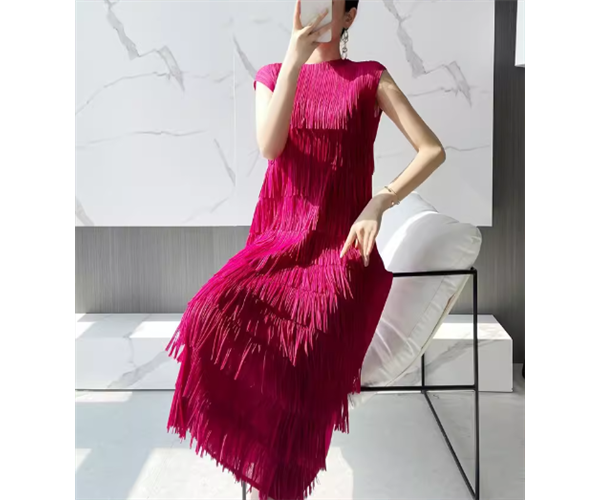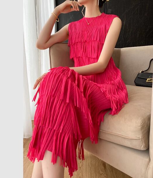 レディース ワンピース プルオーバー ロング 袖なし ノースリーブ ラウンドネック プリーツ フリンジ 大人可愛い シンプル カジュアル 上品 おしゃれ こなれ感 個性的 エレガント モダン 主役級 存在感 ラグジュアリー セレブリティ シック 高級感 芸術的 アーティスティック 華やか 無地 夏 デート お出かけ パーティー イベント レストラン 休日 ホテル インスタ映え フリーサイズ レッド 大人デザイン