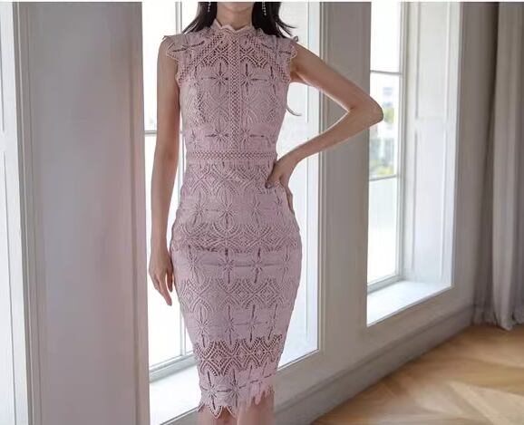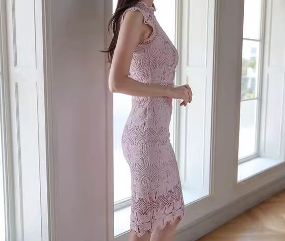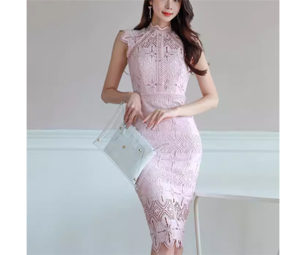 レディース ワンピース プルオーバー ドレス 膝丈 袖なし ノースリーブ ハイネック スタンドカラー タイト スリム 細身 フェミニン レース かわいい 大人可愛い きれいめ 上品 おしゃれ こなれ感 ガーリー エレガント 主役級 存在感 ラグジュアリー セクシー シック 高級感 華やか 夏 デート お出かけ パーティー イベント レストラン 休日 ホテル 普段使い モテ S M L XL 小さめ ピンク 大人カラー 大人デザイン
