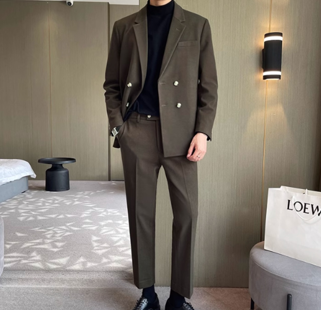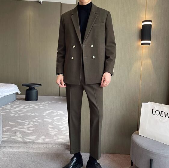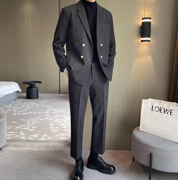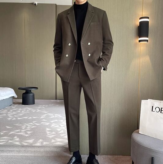 メンズ 男性用 二点セット 上下セット ツーピース ジャケット パンツ スーツ ウール 9分丈 アンクル丈 フルレングス 長袖 襟付き スーツカラー ポケット 前開き ボタン 厚手 上品 おしゃれ かっこいい こなれ感 クール エレガント フォーマル クラシカル 知的 清潔感 爽やか ハンサム シック 高級感 無地 秋 冬 会議 MTG ミーティング オフィス ビジネス OL 通勤 デート お出かけ レストラン ホテル 韓国 普段使い 着回し モテ トレンド M L XL ブラック ブラウン グレー
