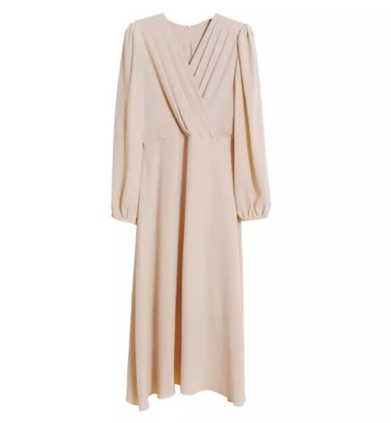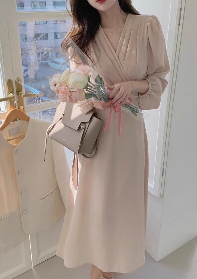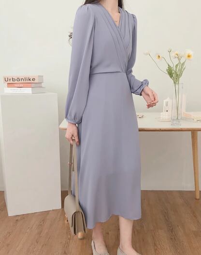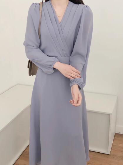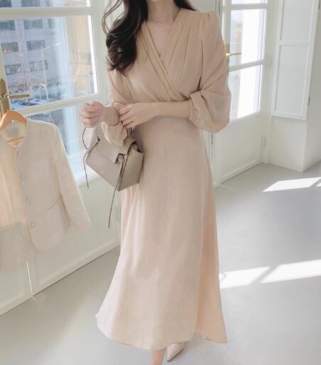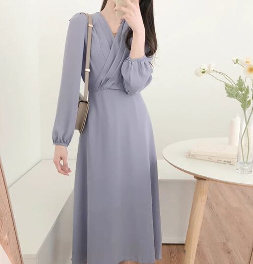 レディース ワンピース プルオーバー ミモレ 長袖 Vネック Aライン ドレープ フェミニン シフォン ウエストマーク ハイウエスト カシュクール 大人可愛い きれいめ シンプル 上品 おしゃれ ガーリー エレガント 知的 清潔感 爽やか シック 高級感 オフィスカジュアル 優しい 無地 秋 OL 通勤 デート お出かけ 旅行 レストラン 女子会 休日 ショッピング カフェ 韓国 普段使い モテ 清楚 S M L XL ブルー アプリコット 大人デザイン