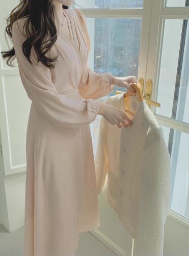 上品で優しい色味が魅力的な長袖のシフォンワンピース。