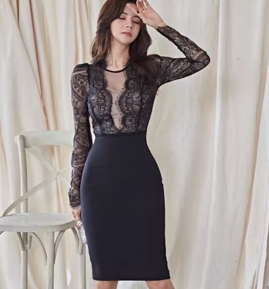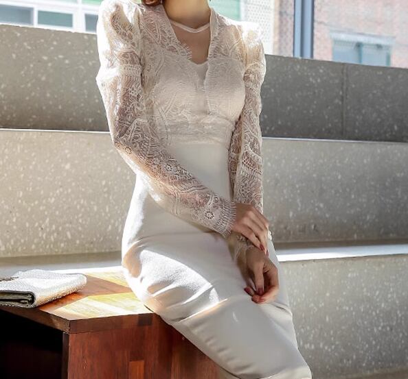 レディース ドレス 膝丈 ミドル丈 長袖 Vネック タイト スリム 細身 レース ハイウエスト 大人可愛い きれいめ シンプル 上品 おしゃれ かっこいい こなれ感 クール エレガント 存在感 ラグジュアリー セレブリティ 知的 セクシー シック 高級感 華やか 秋 冬 デート お出かけ パーティー イベント レストラン 休日 ホテル 韓国 脚長 モテ S M L XL 小さめ ホワイト ブラック 大人デザイン