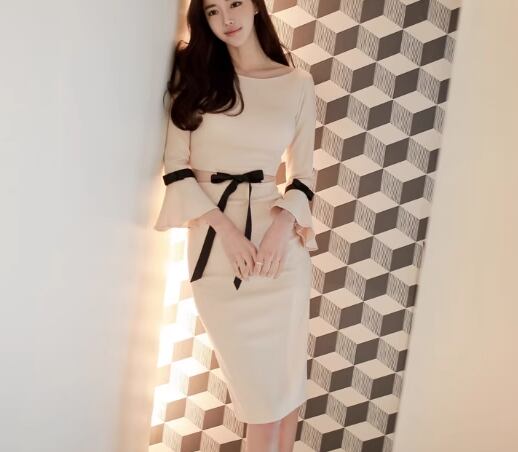 レディース ワンピース プルオーバー ドレス 膝丈 ミドル丈 長袖 ベルスリーブ ラウンドネック スリム 細身 フェミニン ウエストマーク ウエストリボン ハイウエスト かわいい 大人可愛い きれいめ シンプル 上品 おしゃれ レトロ ガーリー エレガント キュート 知的 清潔感 シック 高級感 優しい 無地 秋 デート お出かけ パーティー イベント レストラン 休日 ホテル カフェ 韓国 脚長 普段使い モテ 清楚 S M L XL 小さめ ベージュ