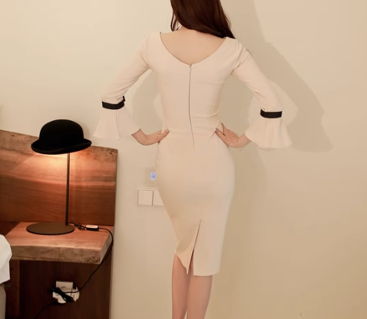 ベージュ×ブラックのシックな二色使いがおしゃれな長袖のミドル丈ドレス。