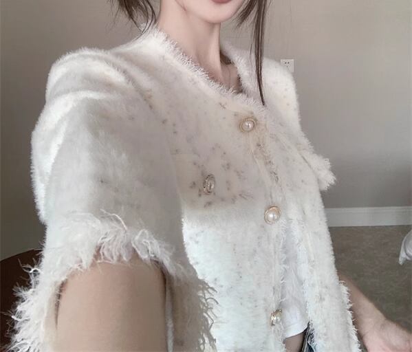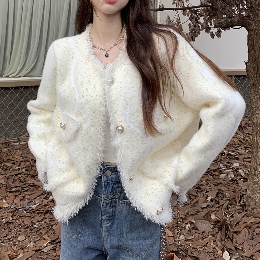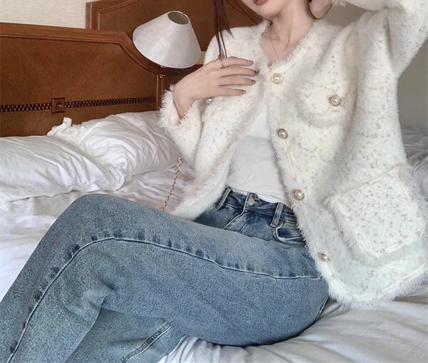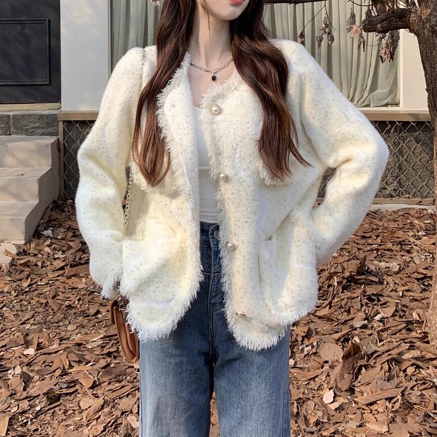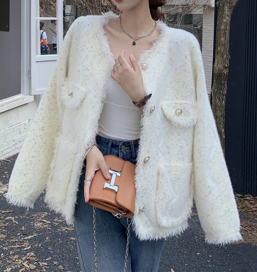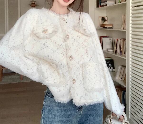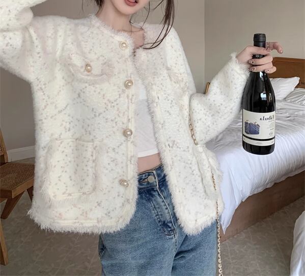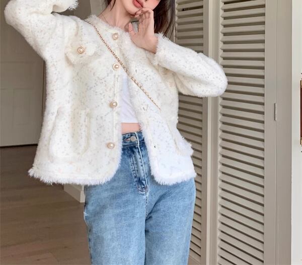 レディース ジャケット 上着 ミドル丈 長袖 ラウンドネック ノーカラー セミフレア ツイード カジュアル ルーズ 学生風 オフィスカジュアル 無地 春 秋 冬 10代 20代 オフィス ビジネス 通勤 ショッピング カフェ S M L ゆったり ホワイト