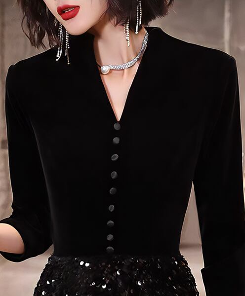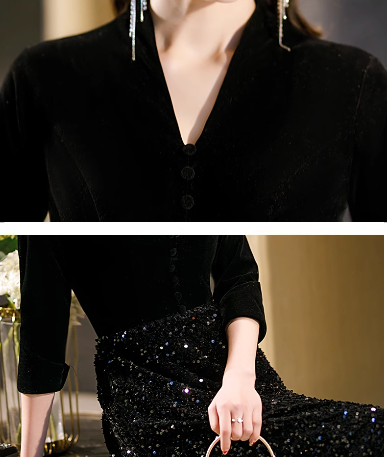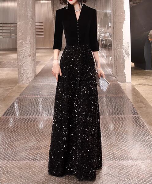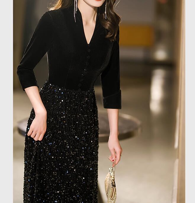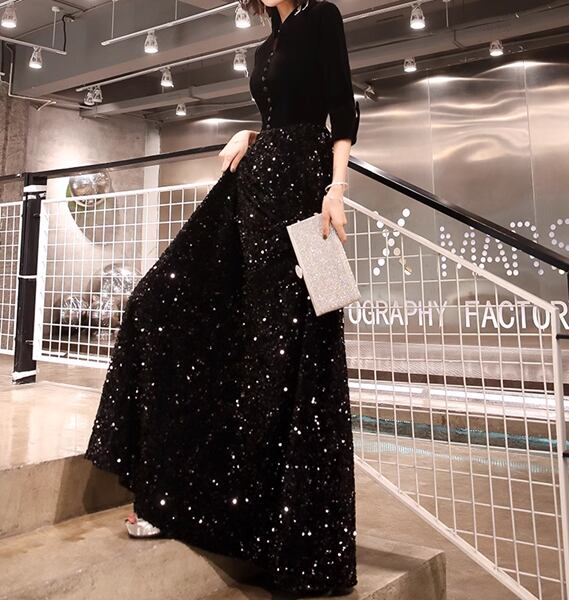 レディース ワンピース フレア ドレス フレアスカート ロングスカート マキシ 丈長 7分袖 Vネック ノーカラー フレア 細身 Aライン フォーマル 裾ワイド フェミニン 前開き スパンコール ボタン ビジュー 上品 エレガント フォーマル 無地 春 秋 冬 謝恩会 10代 20代 パーティー イベント 女子会 コンサート 合コン 韓国 XS S M L XL 2XL 3XL 4XL ブラック