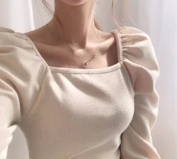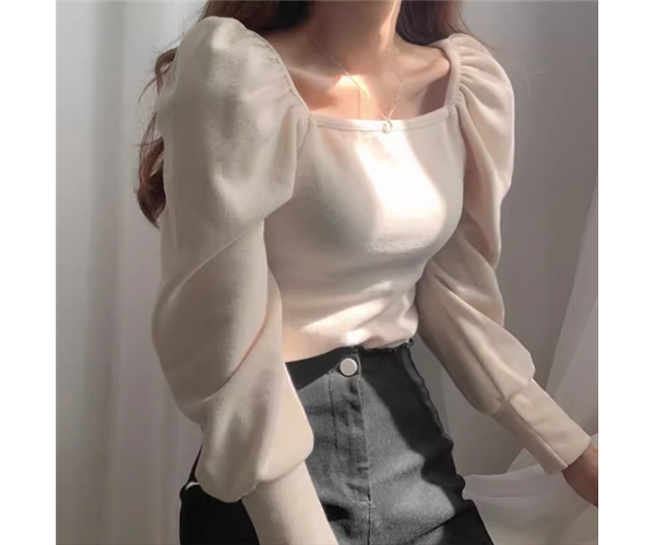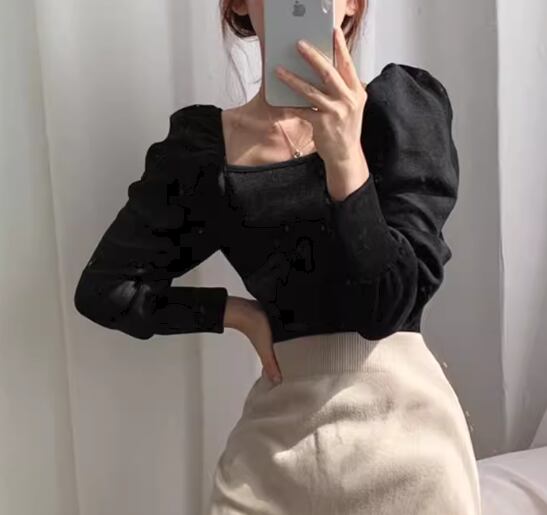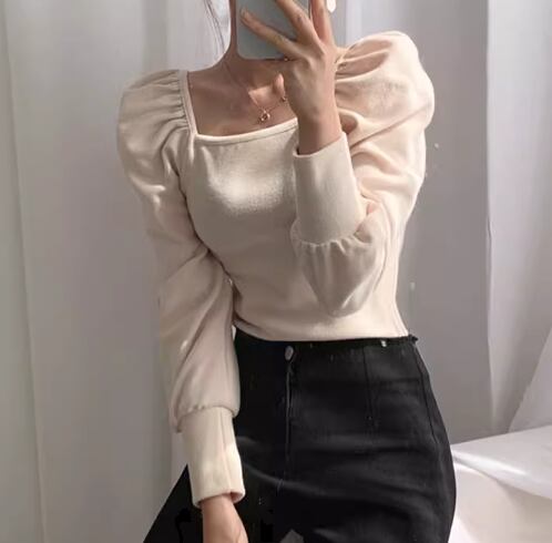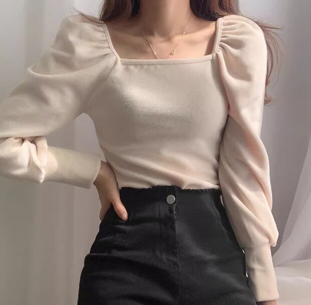 レディース トップス カットソー セーター プルオーバー Tシャツ ショート クロップド丈 長袖 パフスリーブ スクエアネック スリム 細身 大人可愛い きれいめ シンプル 上品 おしゃれ ガーリー エレガント ラグジュアリー ナチュラル 清潔感 爽やか シック 高級感 無地 秋 OL デート お出かけ 旅行 レストラン 女子会 休日 ショッピング カフェ 韓国 普段使い 着回し トレンド 流行 フリーサイズ 小さめ ブラック アプリコット