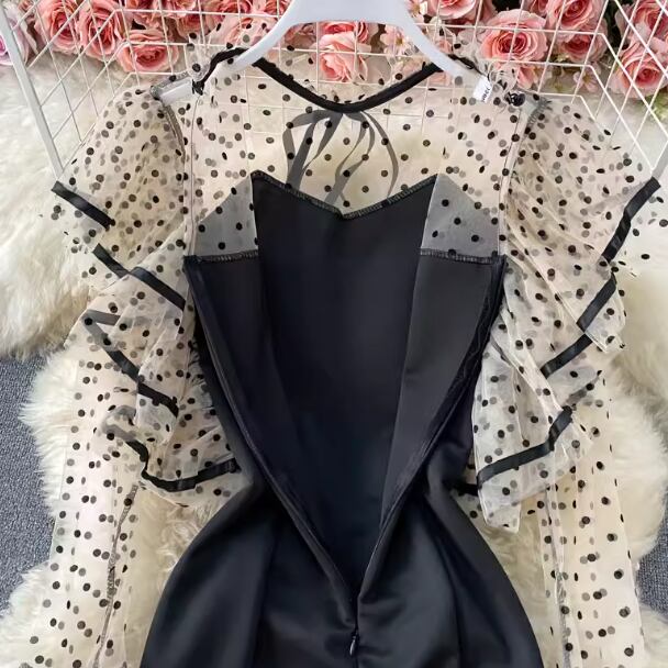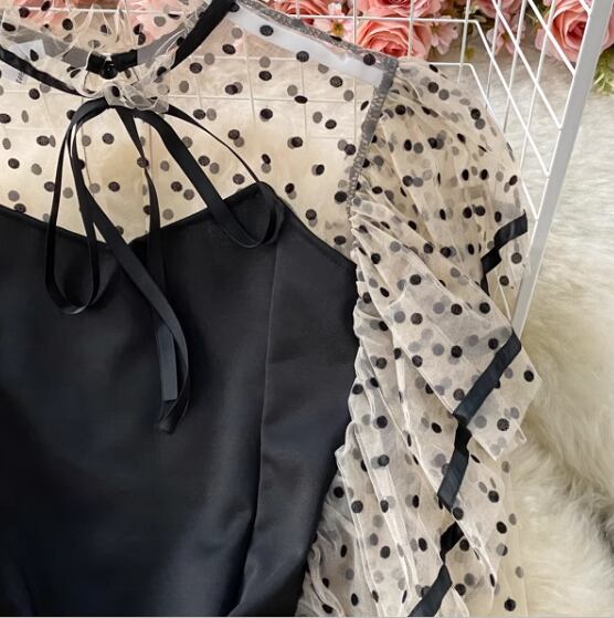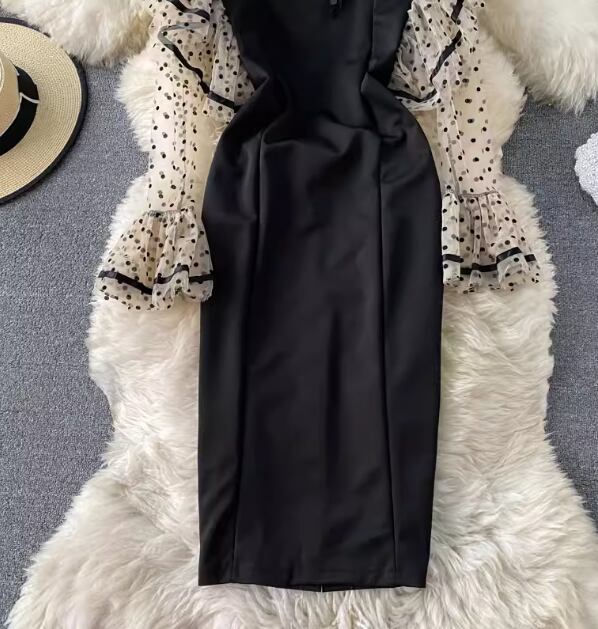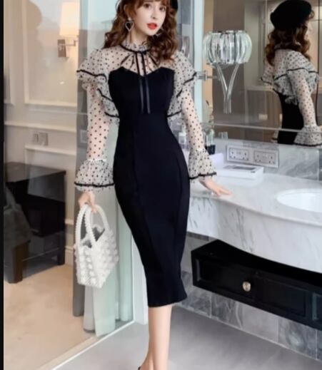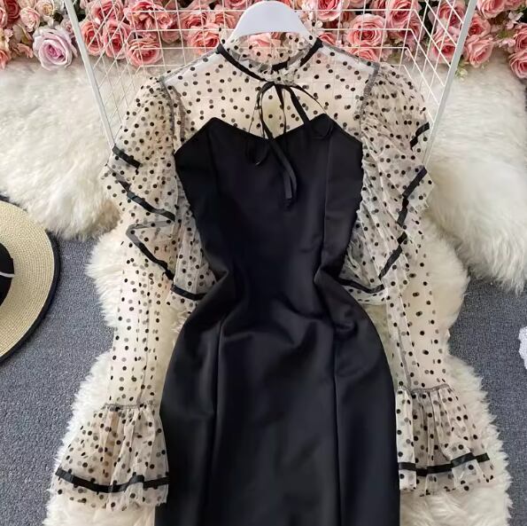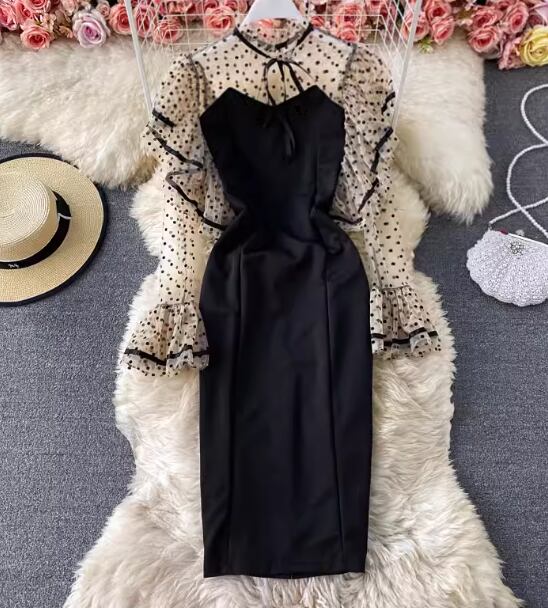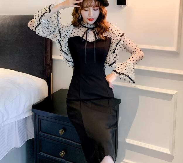 重ね着風 フェイクツーピース レディース ワンピース ドレス ペンシルスカート 膝丈 膝下 ミモレ 長袖 ベルスリーブ スタンドカラー フェミニン フリル リボン ファスナー ハイウエスト 透け感 シースルー 切り替えデザイン ドッキング かわいい 大人可愛い きれいめ 上品 おしゃれ レトロ こなれ感 ガーリー 個性的 エレガント モダン 主役級 存在感 ラブリー キュート ラグジュアリー 水玉 秋 冬 10代 20代 学生 デート お出かけ 普段使い モテ S M L XL ブラック