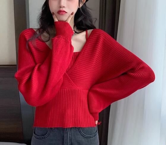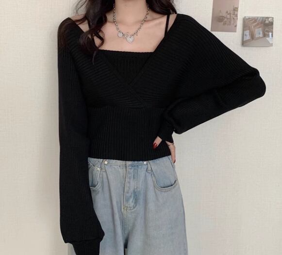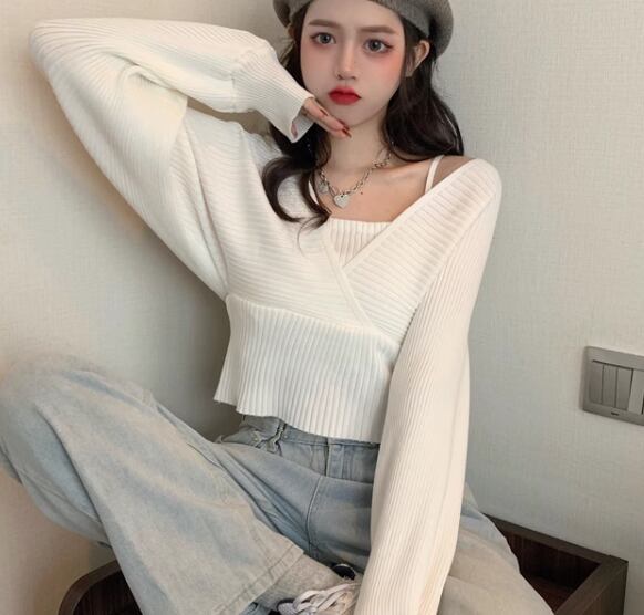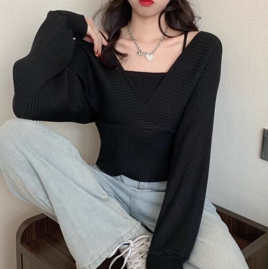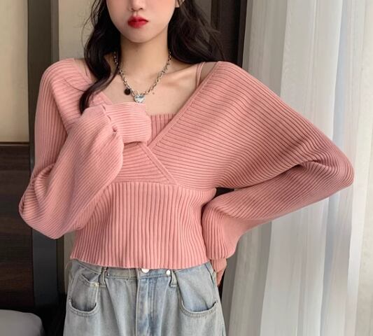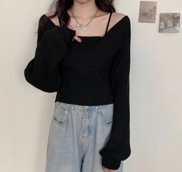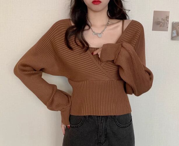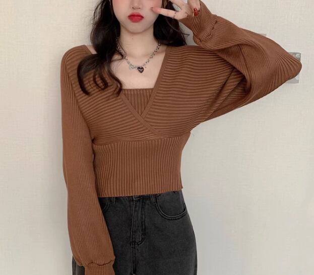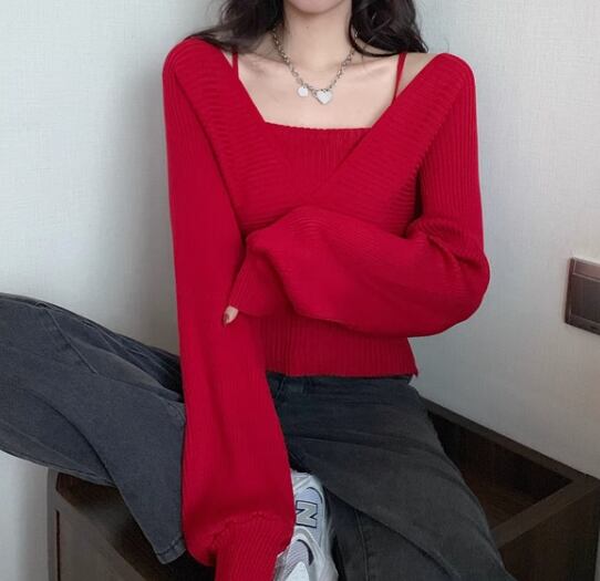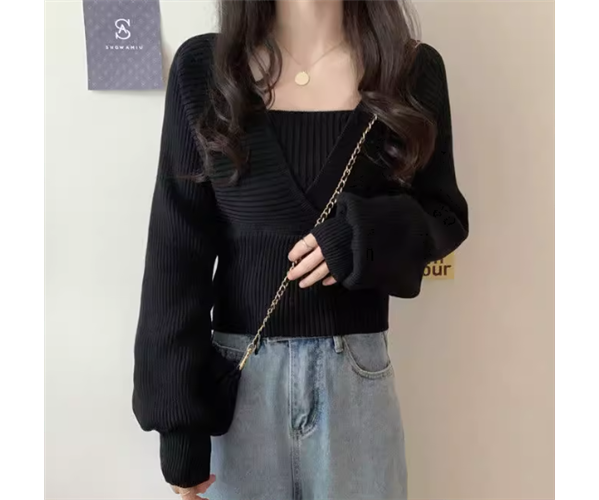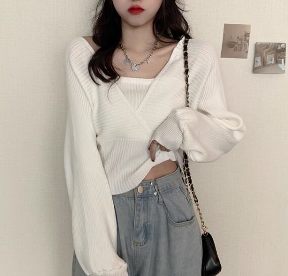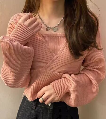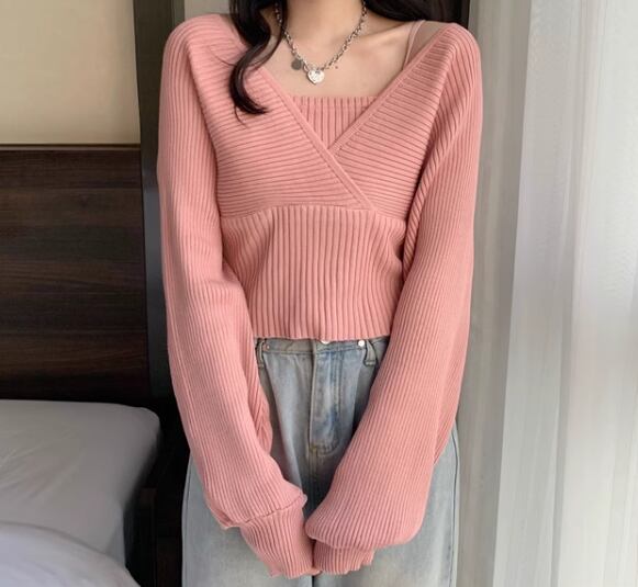 重ね着風 フェイクレイヤード フェイクツーピース レディース トップス ニット セーター プルオーバー ショート クロップド丈 長袖 ボリューム袖 パフスリーブ スクエアネック スリム 細身 かわいい 大人可愛い きれいめ シンプル カジュアル おしゃれ かっこいい こなれ感 個性的 エレガント ラグジュアリー ナチュラル シック 高級感 スタイリッシュ 無地 秋 デート お出かけ 韓国 普段使い 着回し トレンド 流行 フリーサイズ 小さめ ホワイト ブラック ブラウン ピンク レッド