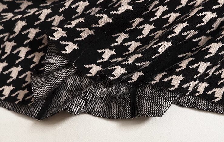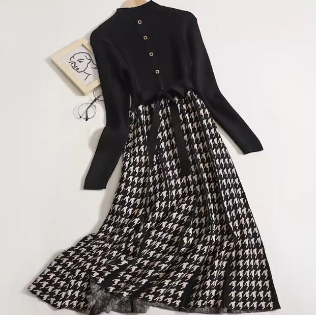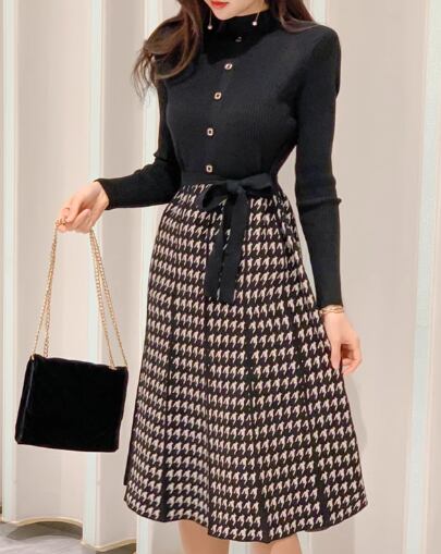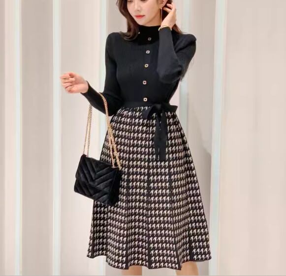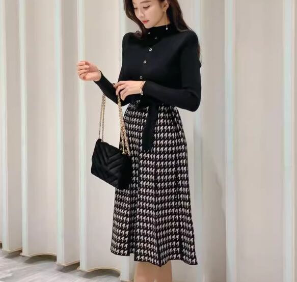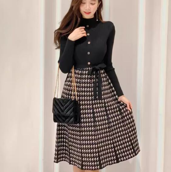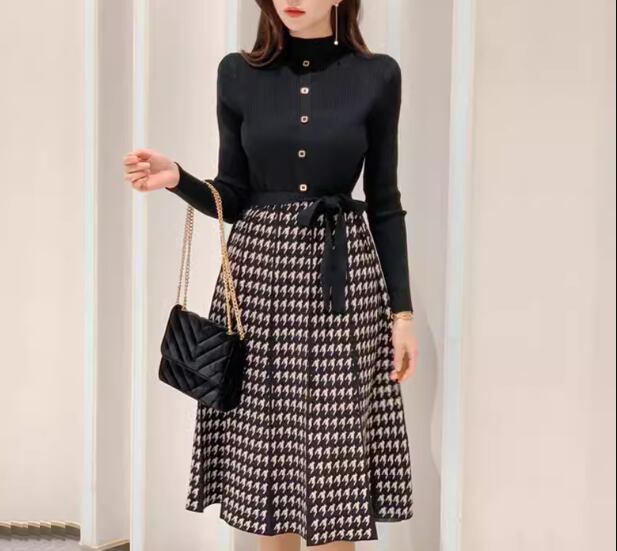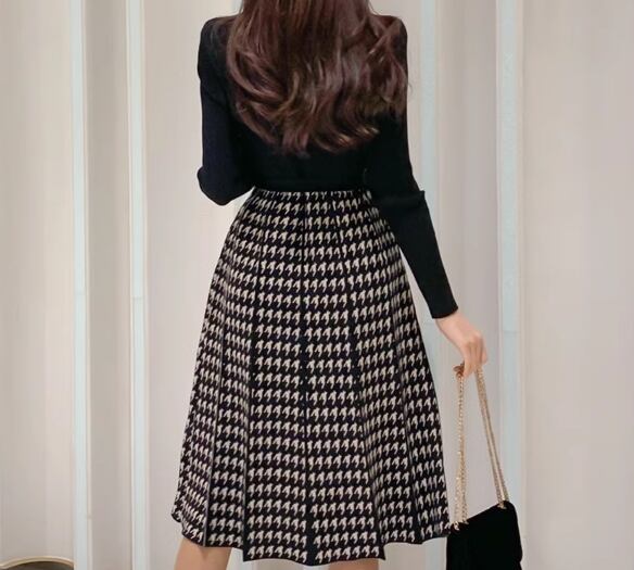 長袖のニットセーターと膝丈の千鳥格子柄のスカートの二点セットです。