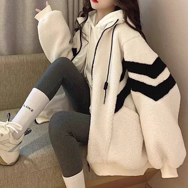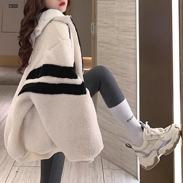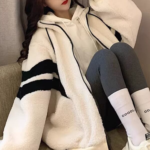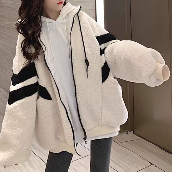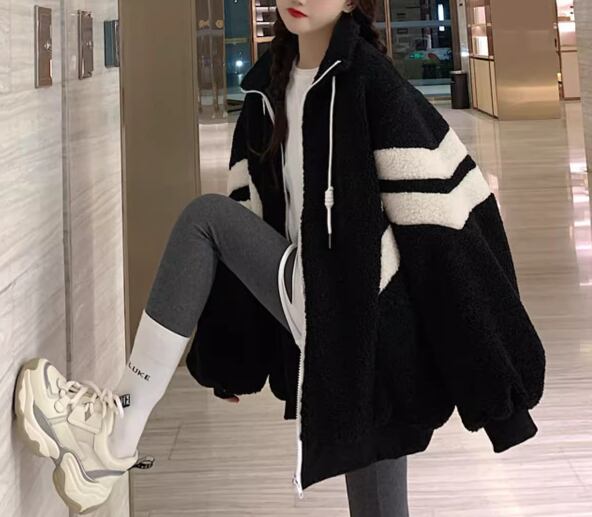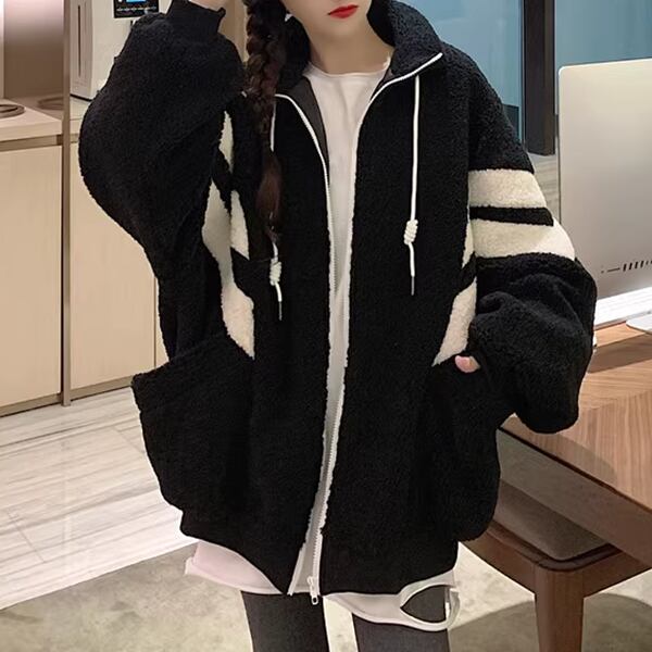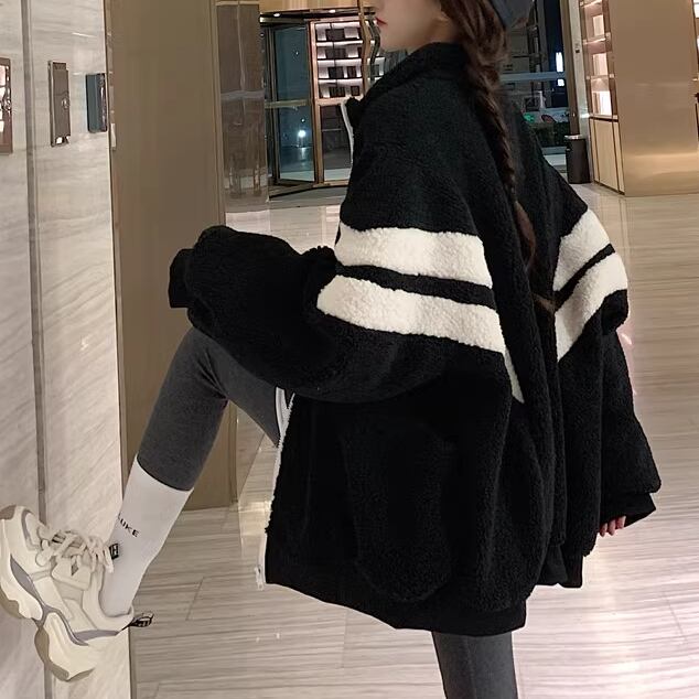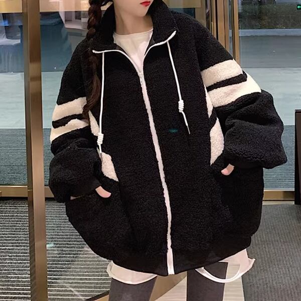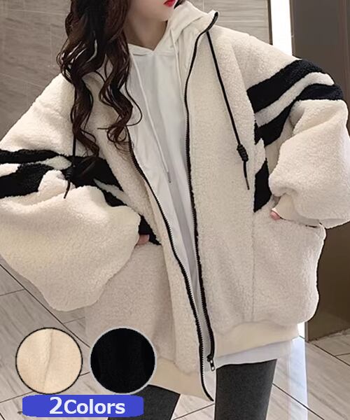2色展開 メンズ レディース ブルゾン アウター 上着 ウール ボアジャケット スタジャン 長袖 スタンドカラー ワイド ふっくら ジッパー バイカラー ボアブルゾン カジュアル エレガント ボーダー オーバーサイズ 韓国 ユニセックス 10代 20代 アウトドア ガーデン ショッピング カフェ ゆったり