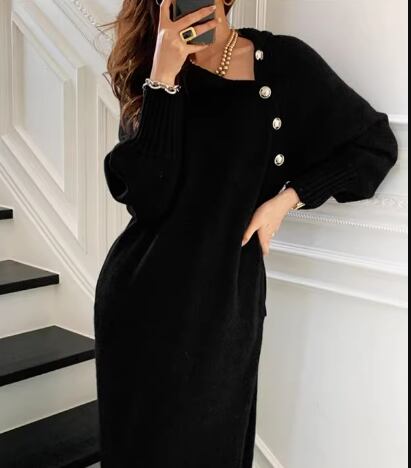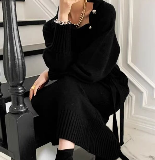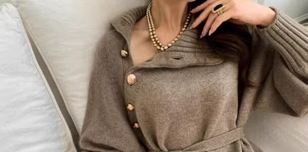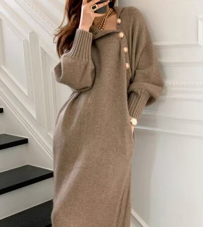 シックで上品な秋カラーが魅力的な長袖のニットワンピース。