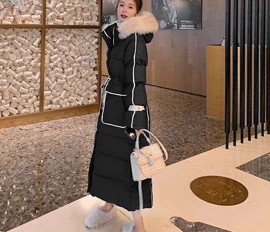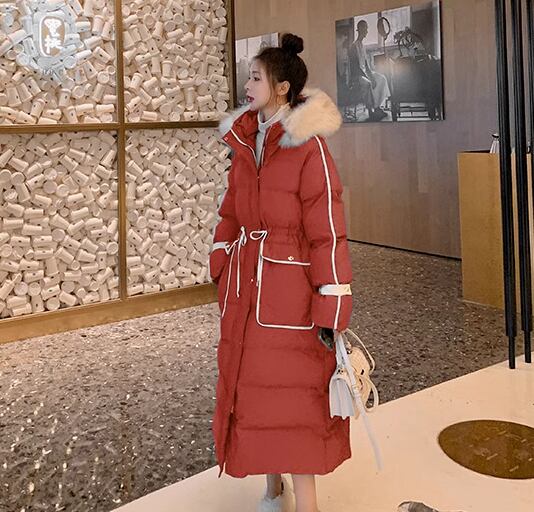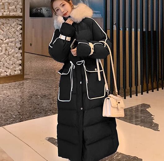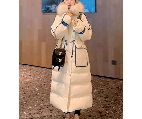 ファー付きの襟がアクセントになっていておしゃれなロング丈のダウンジャケット。