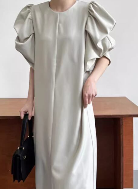 シンプルなデザインが大人可愛い半袖のミモレ丈ドレス。