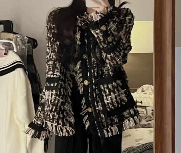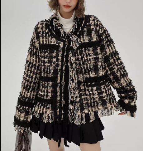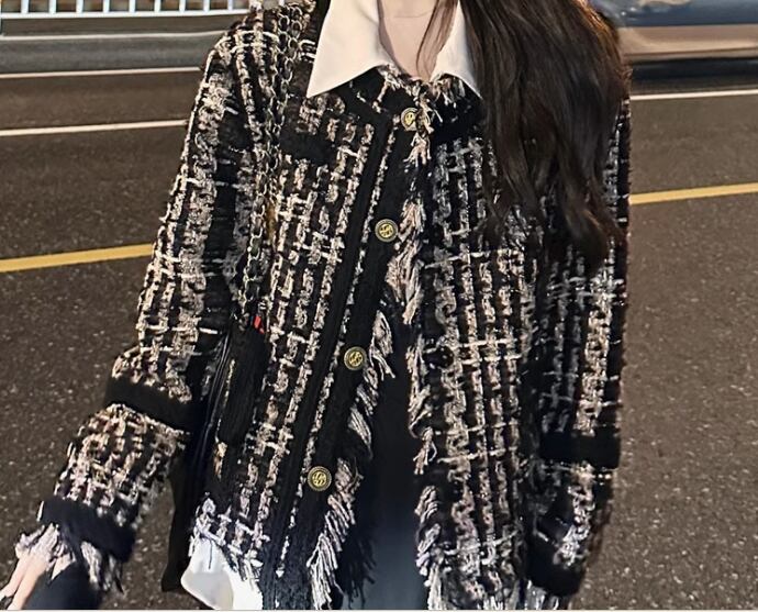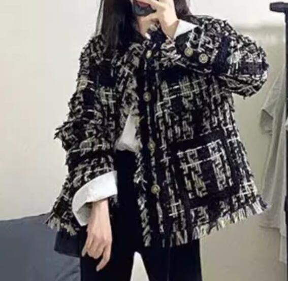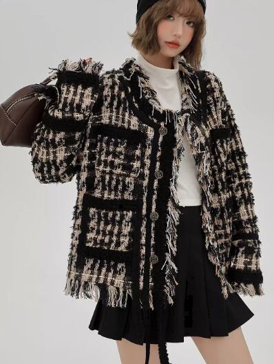 レディース ジャケット ノーカラージャケット ミドル丈 長袖 ポケット 厚手 ツイード フリンジ 大人可愛い カジュアル 上品 おしゃれ かっこいい レトロ こなれ感 ルーズ 個性的 クール エレガント モダン 存在感 ラグジュアリー ハンサム シック 高級感 芸術的 アーティスティック スタイリッシュ 秋 冬 デート お出かけ 休日 ショッピング モノトーン 韓国 普段使い 着回し トレンド 流行 S M L XL ゆったり ゆる 大きめ オーバーサイズ ブラック