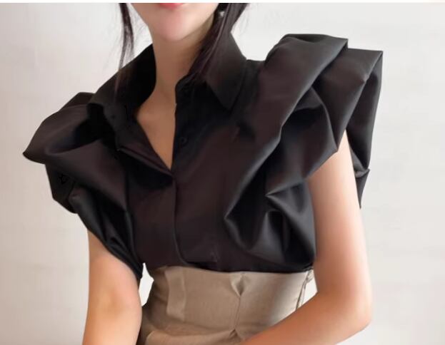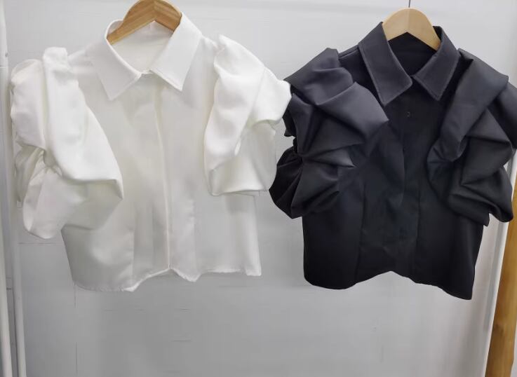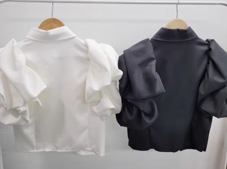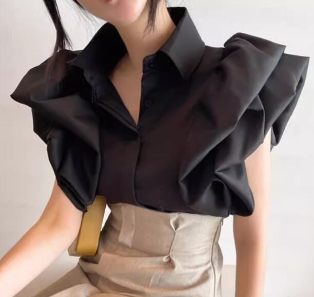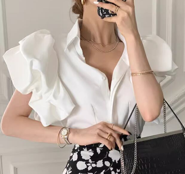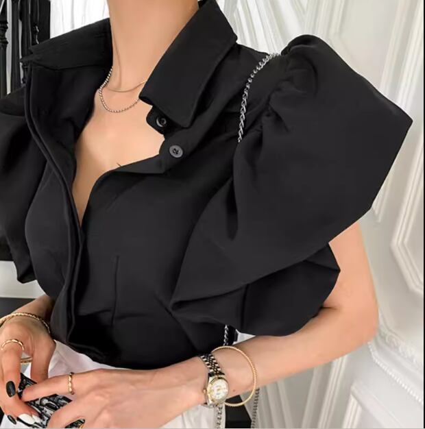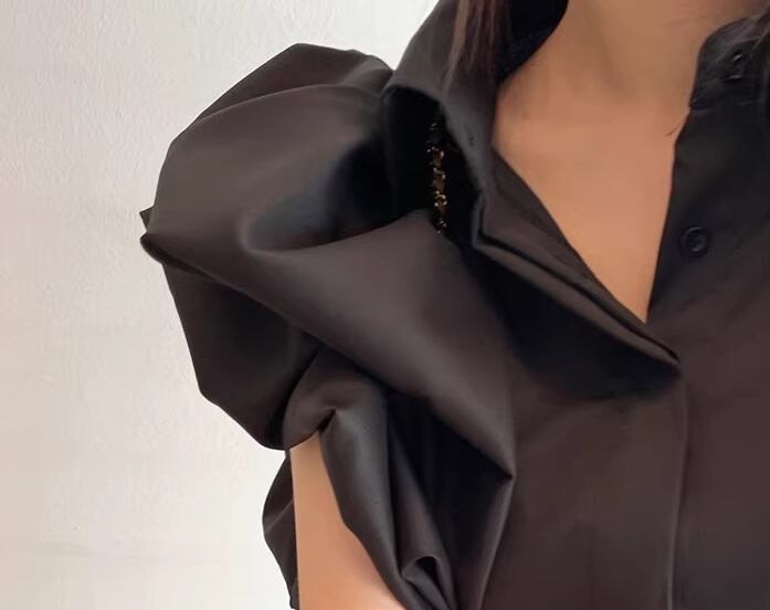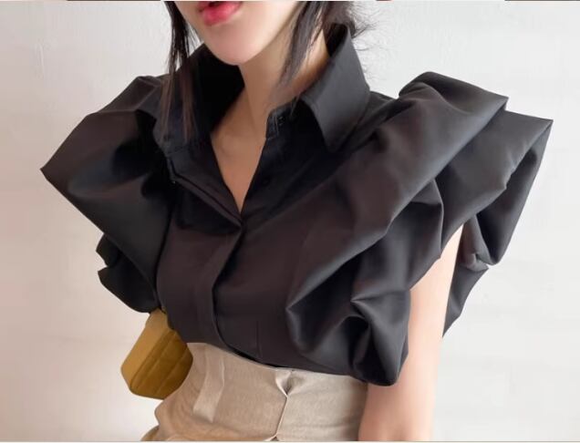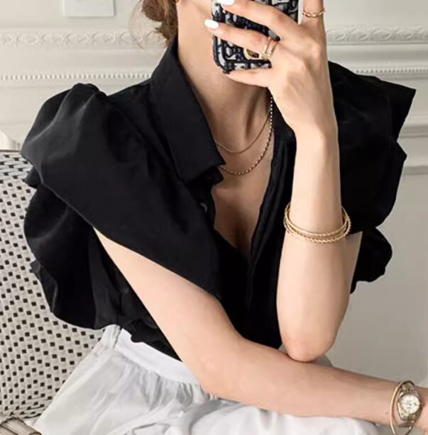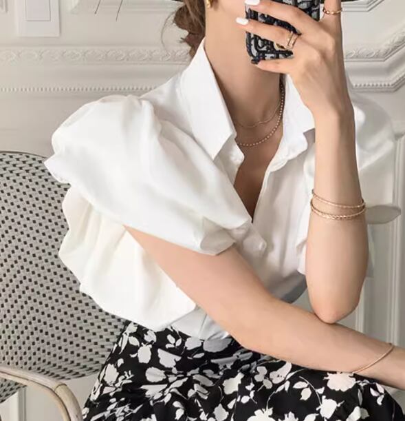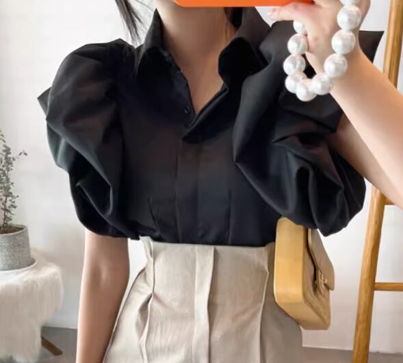 レディース トップス シャツ ショート 半袖 ボリューム袖 パフスリーブ 襟付き ポロカラー ボタン 大人可愛い きれいめ シンプル カジュアル おしゃれ 個性的 存在感 ラグジュアリー 清潔感 シック 高級感 芸術的 アーティスティック スタイリッシュ 無地 夏 デート お出かけ 旅行 休日 ショッピング モノトーン 韓国 普段使い 着回し トレンド 流行 S M L ホワイト ブラック