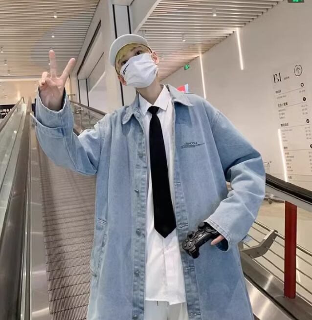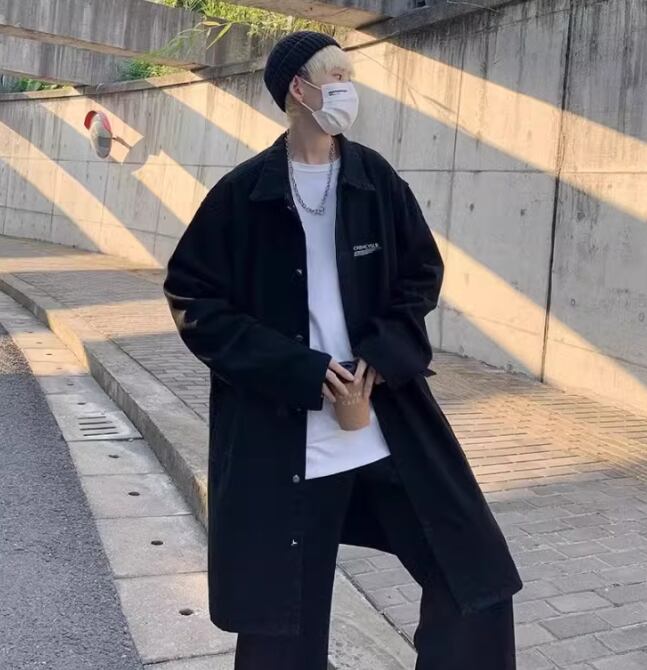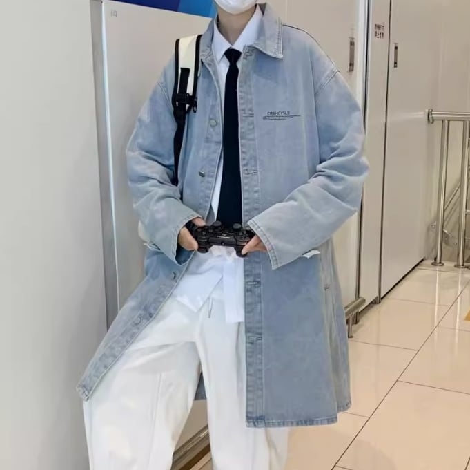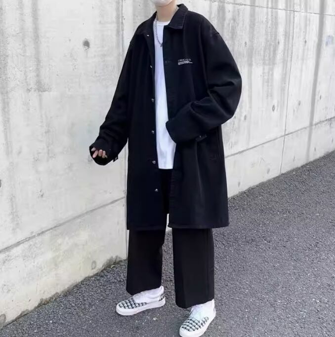 メンズ コート アウター トレンチ ステンカラーコート 膝丈 ロング 長袖 ポロカラー Aライン 前開き デニム ブルーデニム カラーデニム 中厚手 綿 シンプル カジュアル おしゃれ かっこいい こなれ感 ラフ ボーイッシュ 個性的 主役級 存在感 キュート カレッジ風 学生風 アメリカン 無地 春 秋 学生 通学 デート お出かけ リゾート 旅行 レストラン 公園 休日 バカンス ショッピング 合コン コンパ カフェ 防寒 トレンド 流行 M L XL 2XL 3XL ゆったり ゆる ブラック ブル